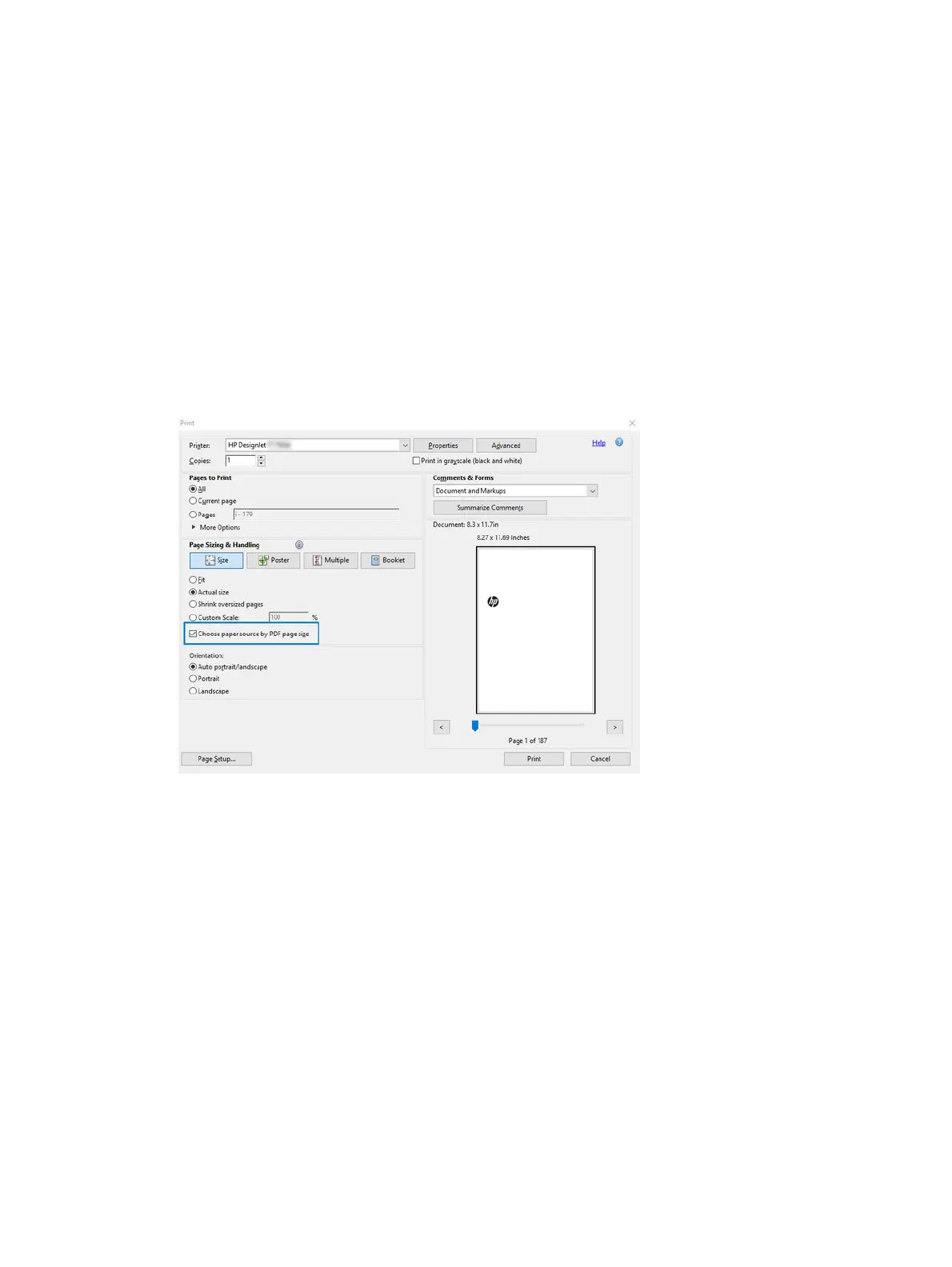 4. Schakel het selectievakje Choose paper source by PDF page size (Papierbron op PDF-