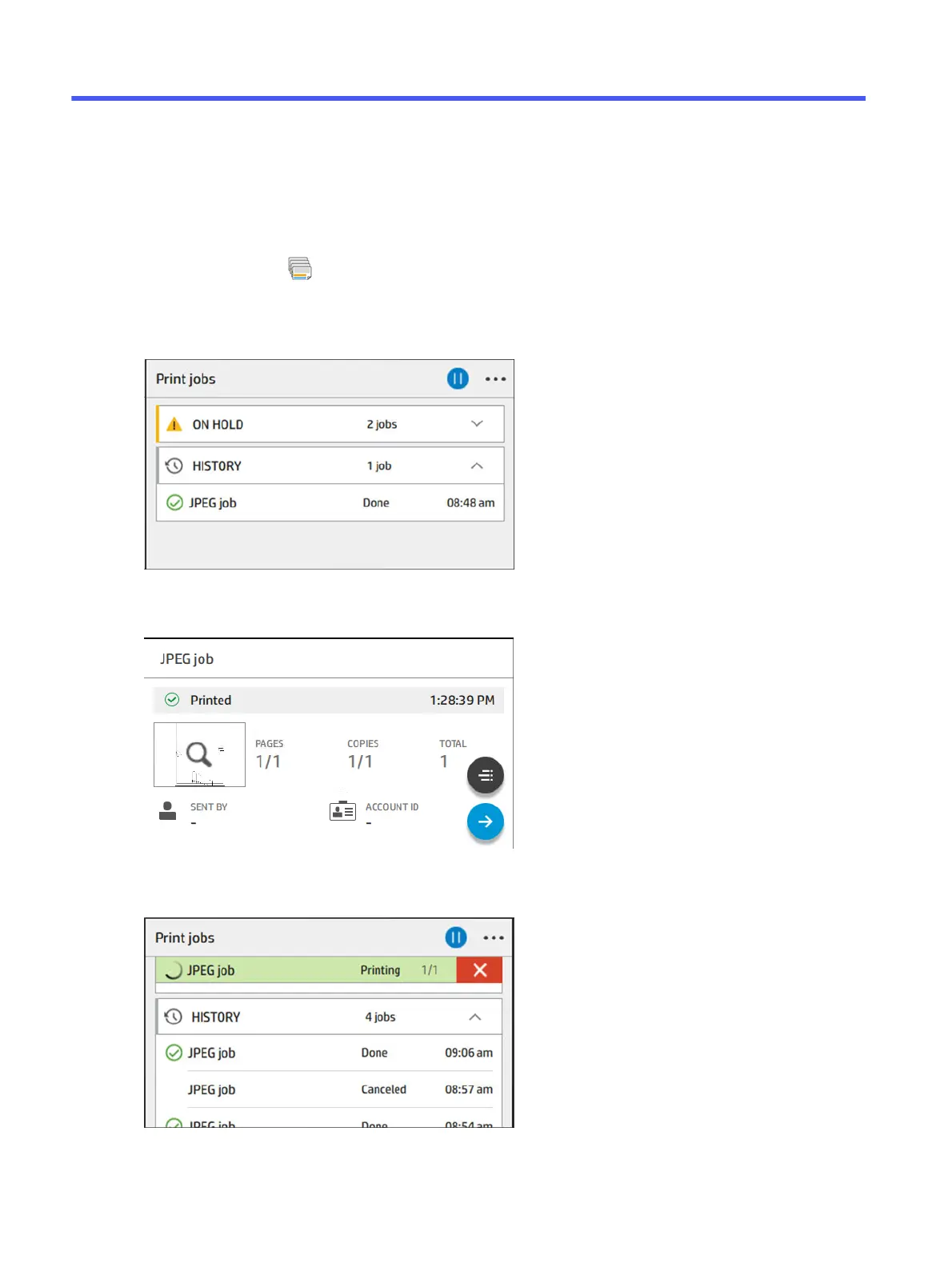 Tik op het pictogram Jobs (Taken) op het beginscherm om de taakwachtrij op het front panel te