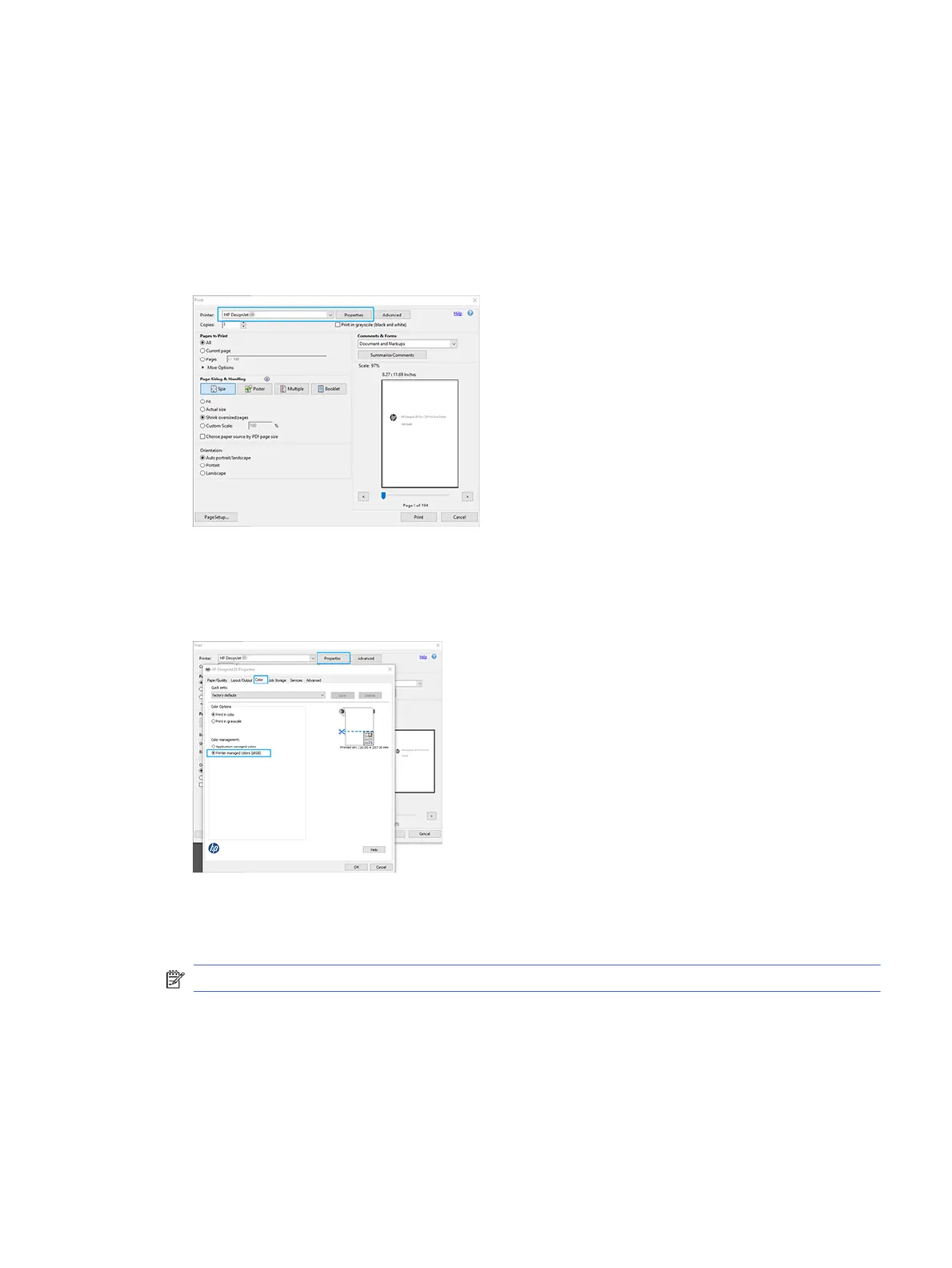 dialoogvenster Print (Afdrukken) om de kleurbeheeropties in te stellen. Schakel het selectievakje