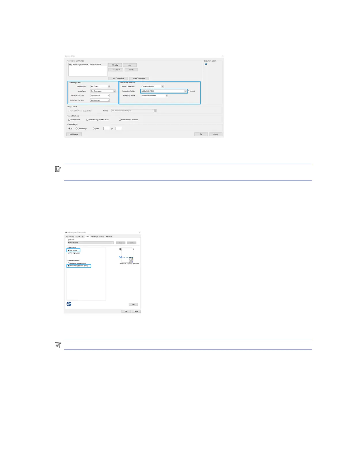 BELANGRIJK: Selecteer Print in Color (In kleur afdrukken) en Printer Managed Colors (Kleuren