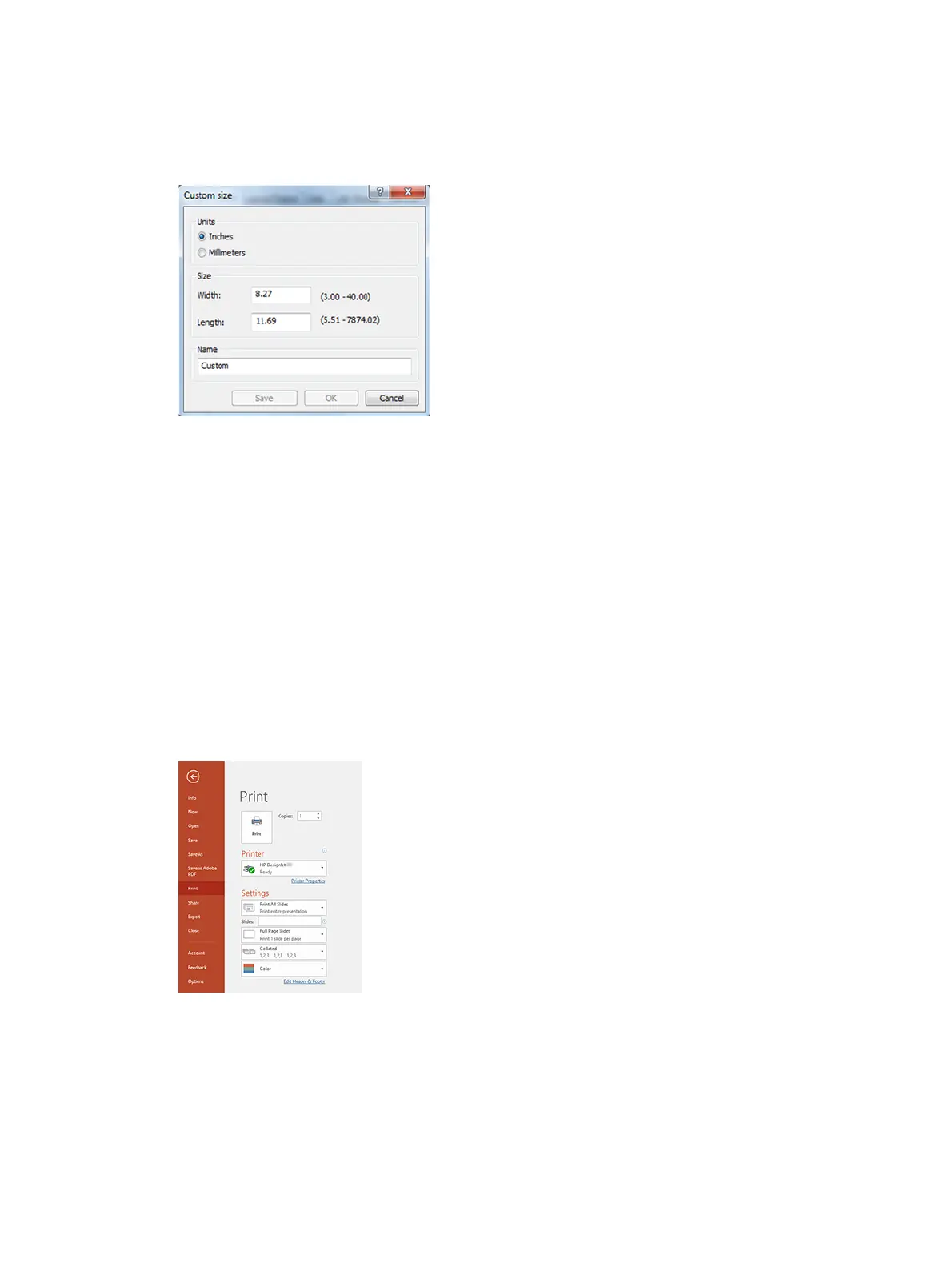 de lengte en de naam van uw aangepaste papierformaat in. Klik op de knop Save (Opslaan) en OK.