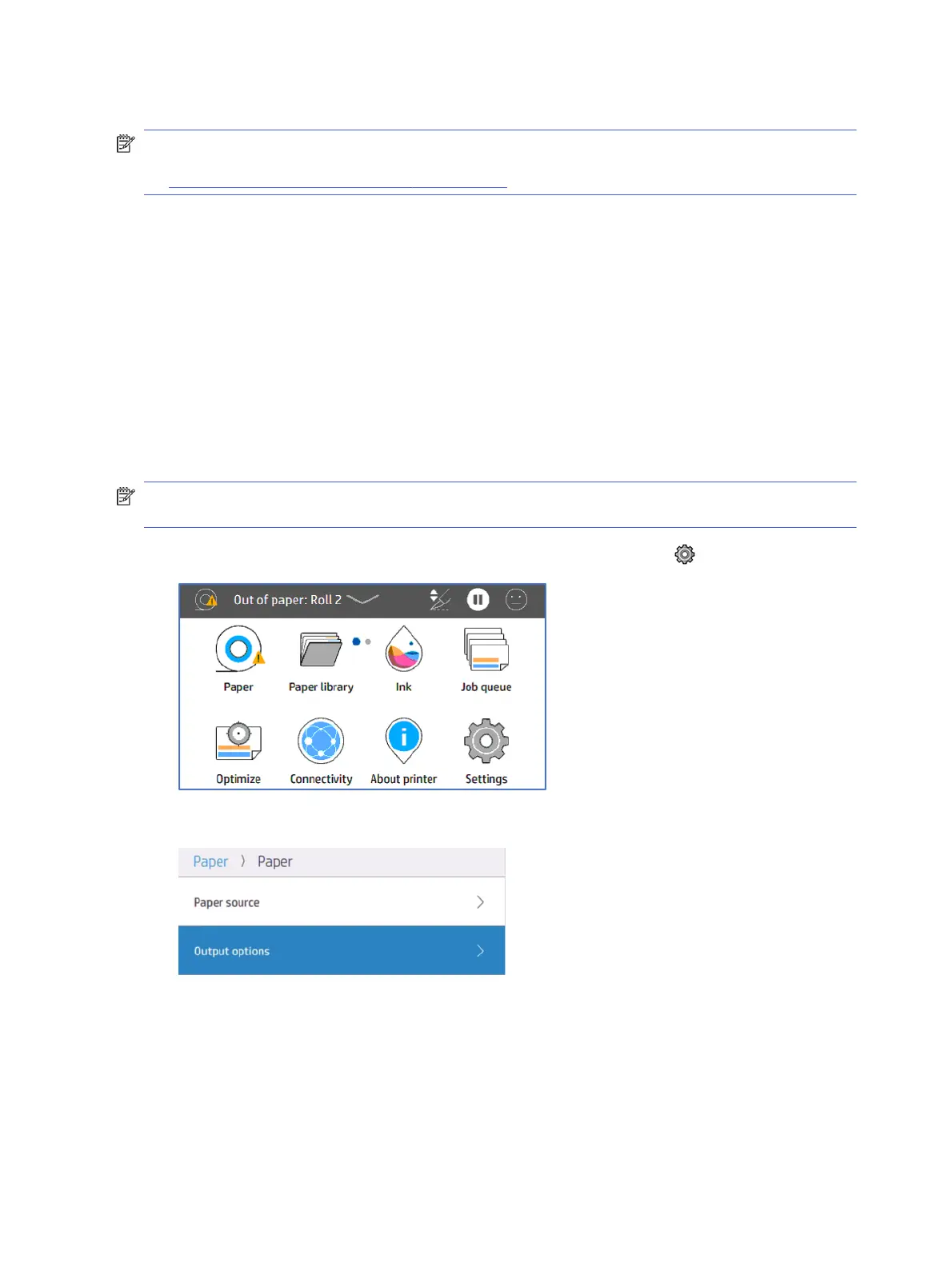 1. Ga naar het front panel en tik op Papier en vervolgens op het pictogram Instellingen.