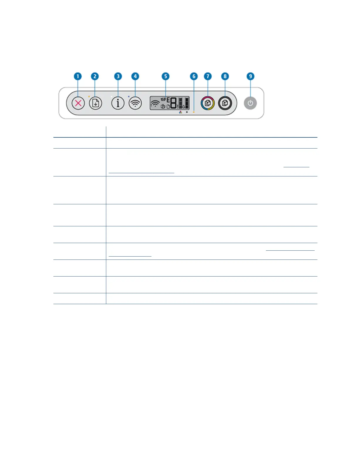 5 Control panel display : Indicates number of copies, wireless status and signal strength, Wi-Fi Direct status,