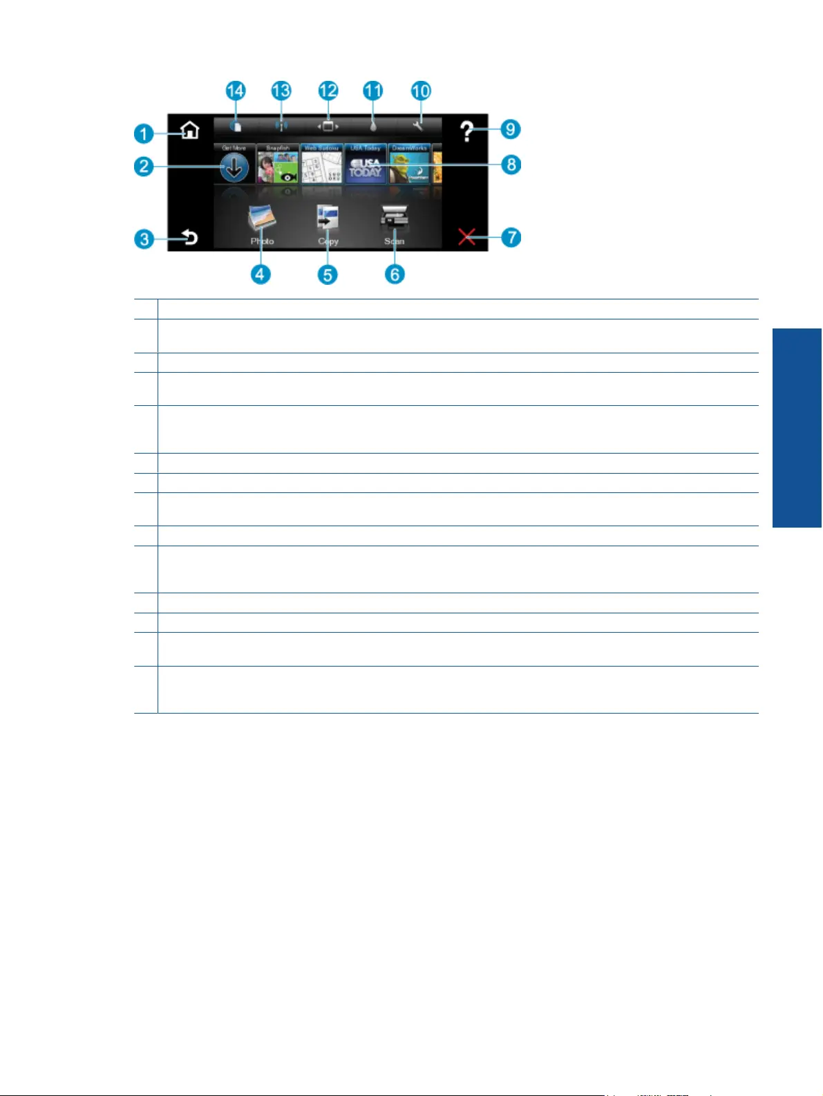 1 Thuis: Keert terug naar het Thuis-scherm, het scherm dat verschijnt wanneer u de printer voor het eerst inschakelt.