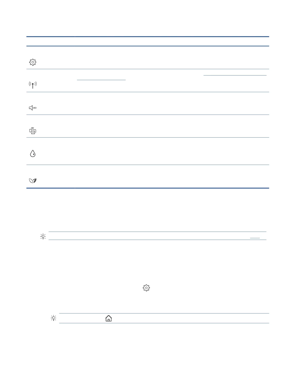 The Home screen of the control panel display shows the available functions for the printer. Some features of