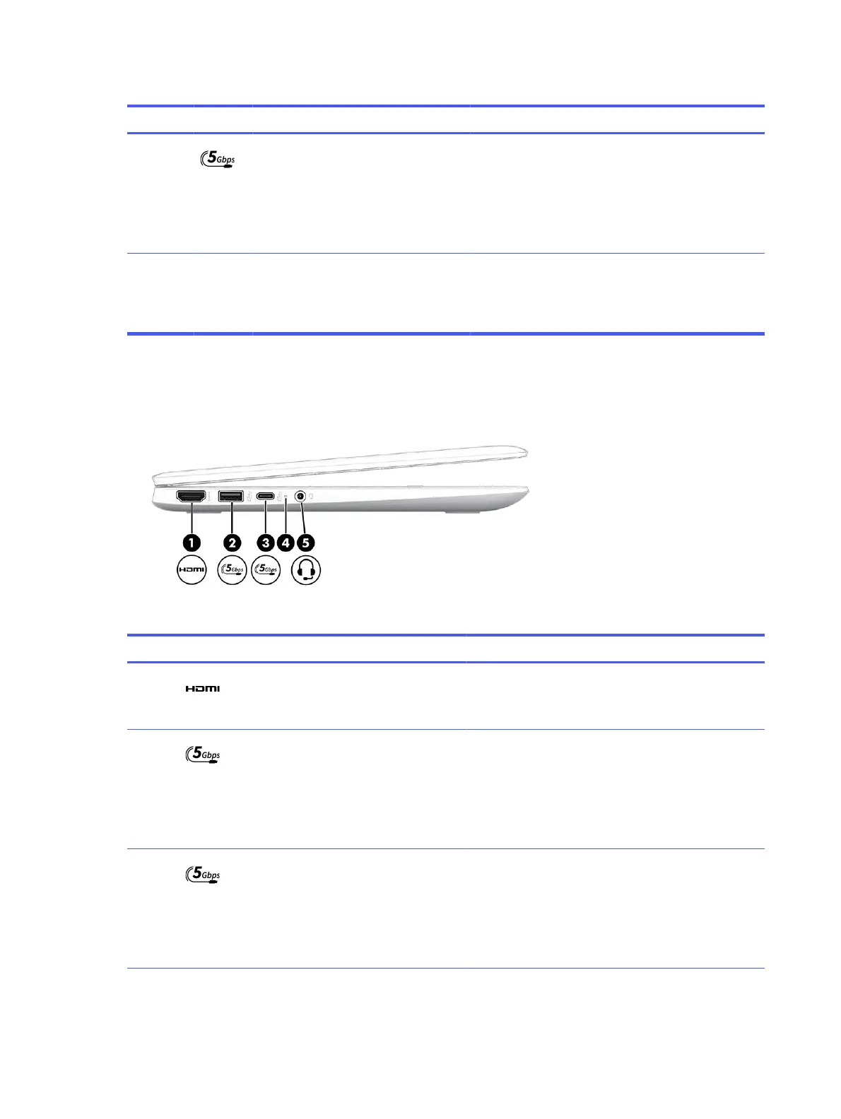(2) USB 5 Gbps port Connects a USB device, provides high-speed data