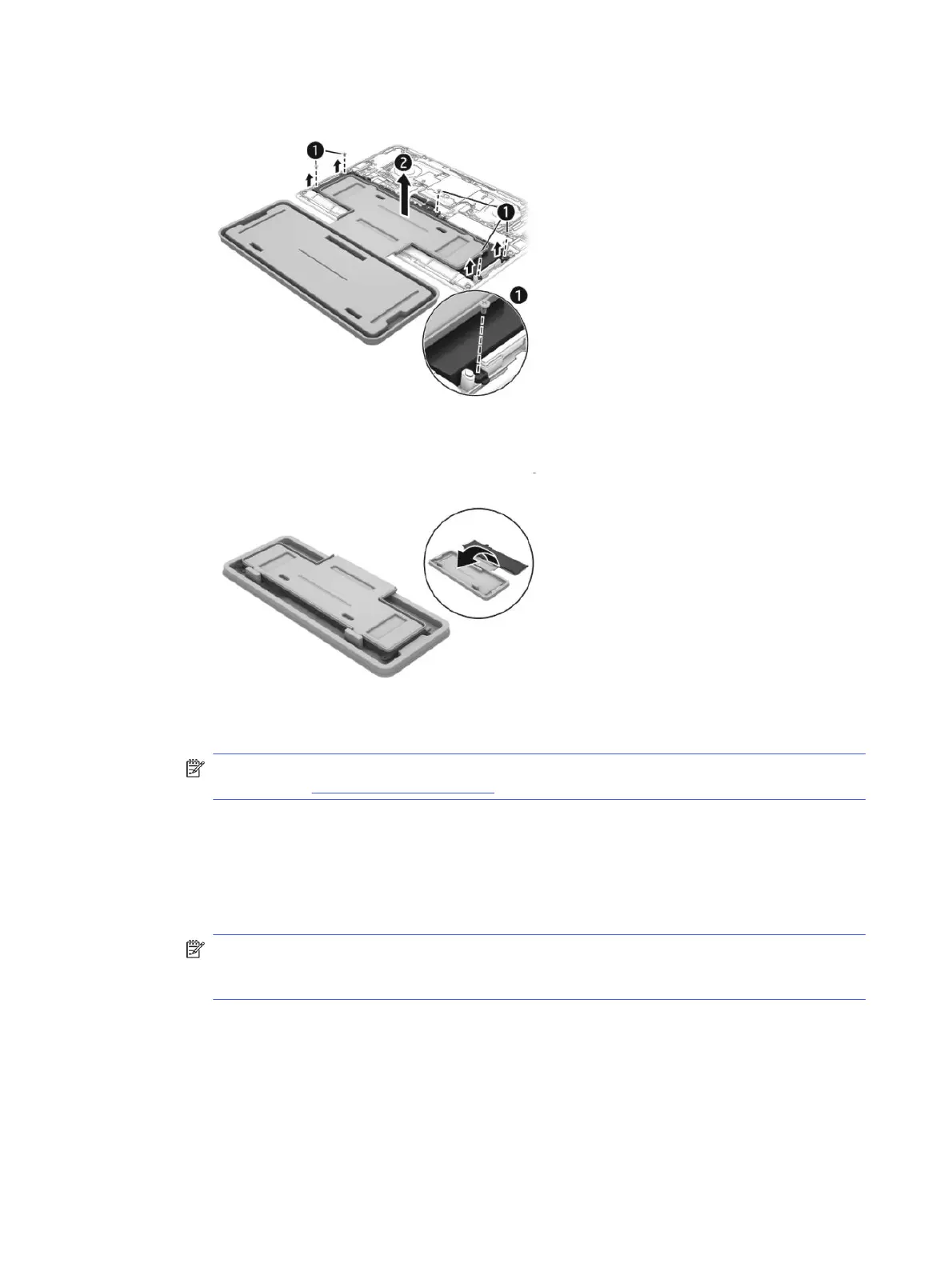 b. Turn the tray (1) over so the battery is facing downward, and then insert the battery (2) into the