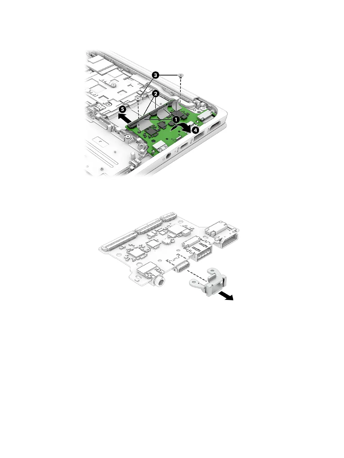 g. Lift the inside of the board (4) up, and then pull the board (5) into the computer to remove it.