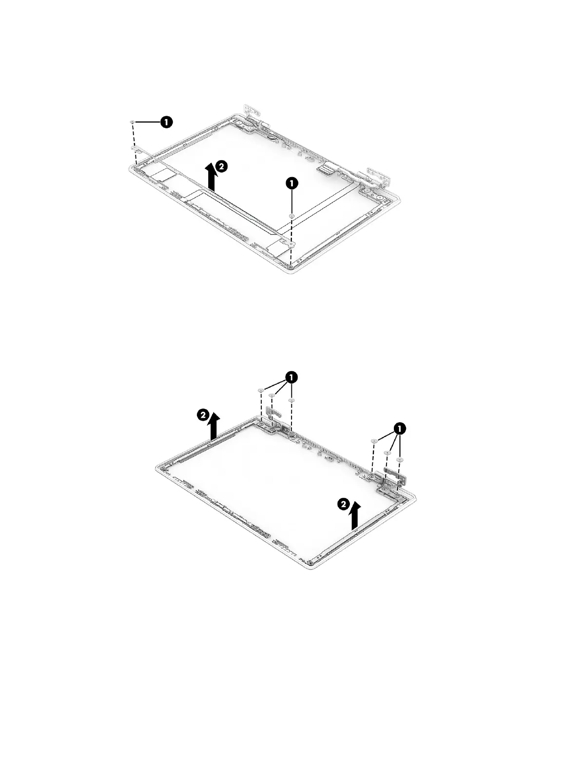 b. Remove the hinges (2) from the display back cover.