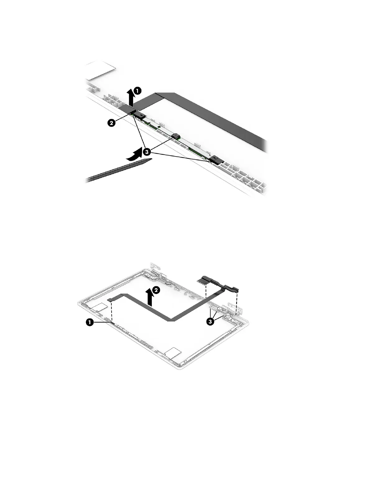 module. Peel the cable (2) off the inside of the display rear cover, and then remove the cable from