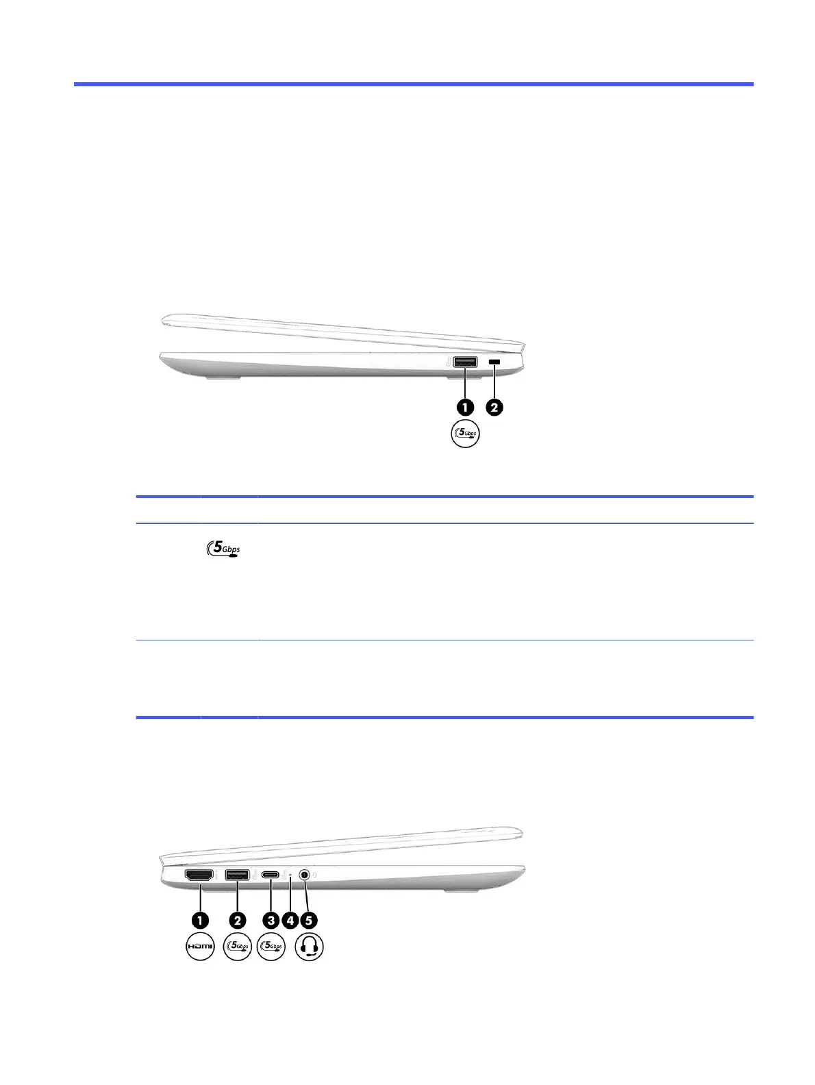 (1) USB 5 Gbps port Connects a USB device, provides high-speed data