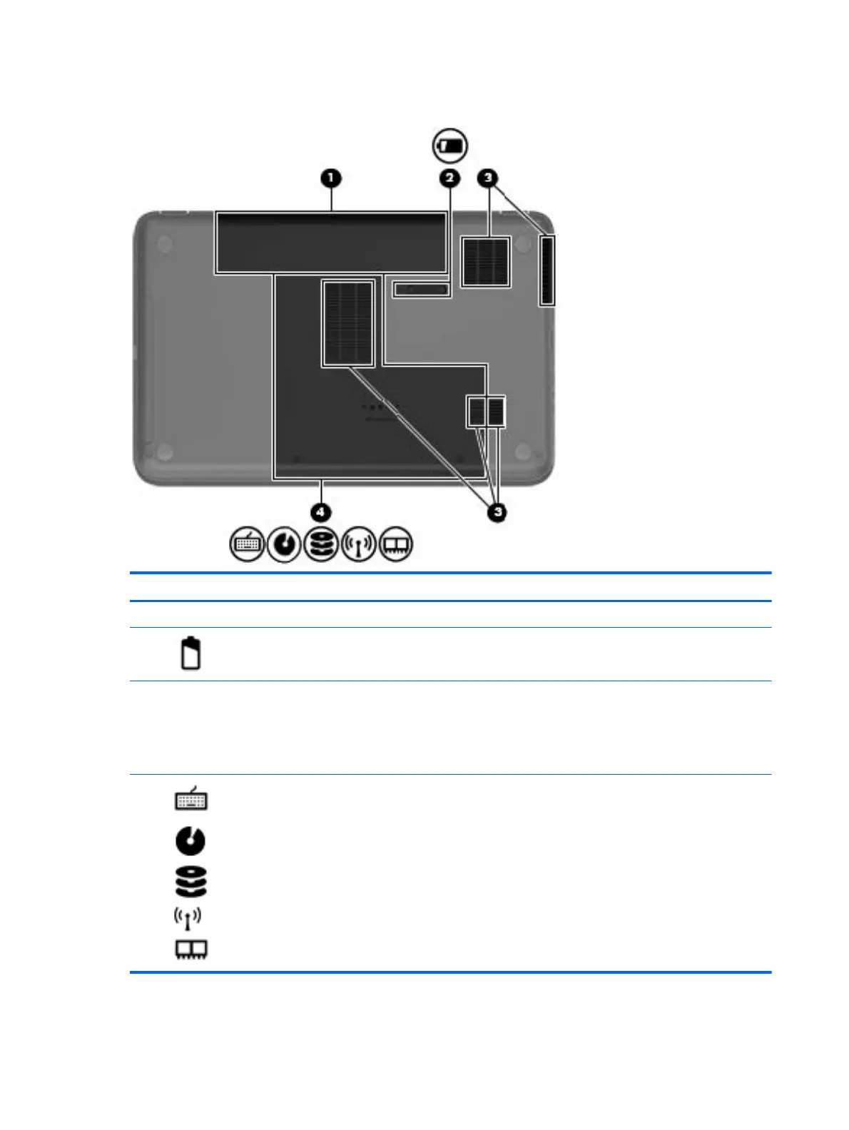 Service door Provides access to the keyboard, optical drive, hard drive,