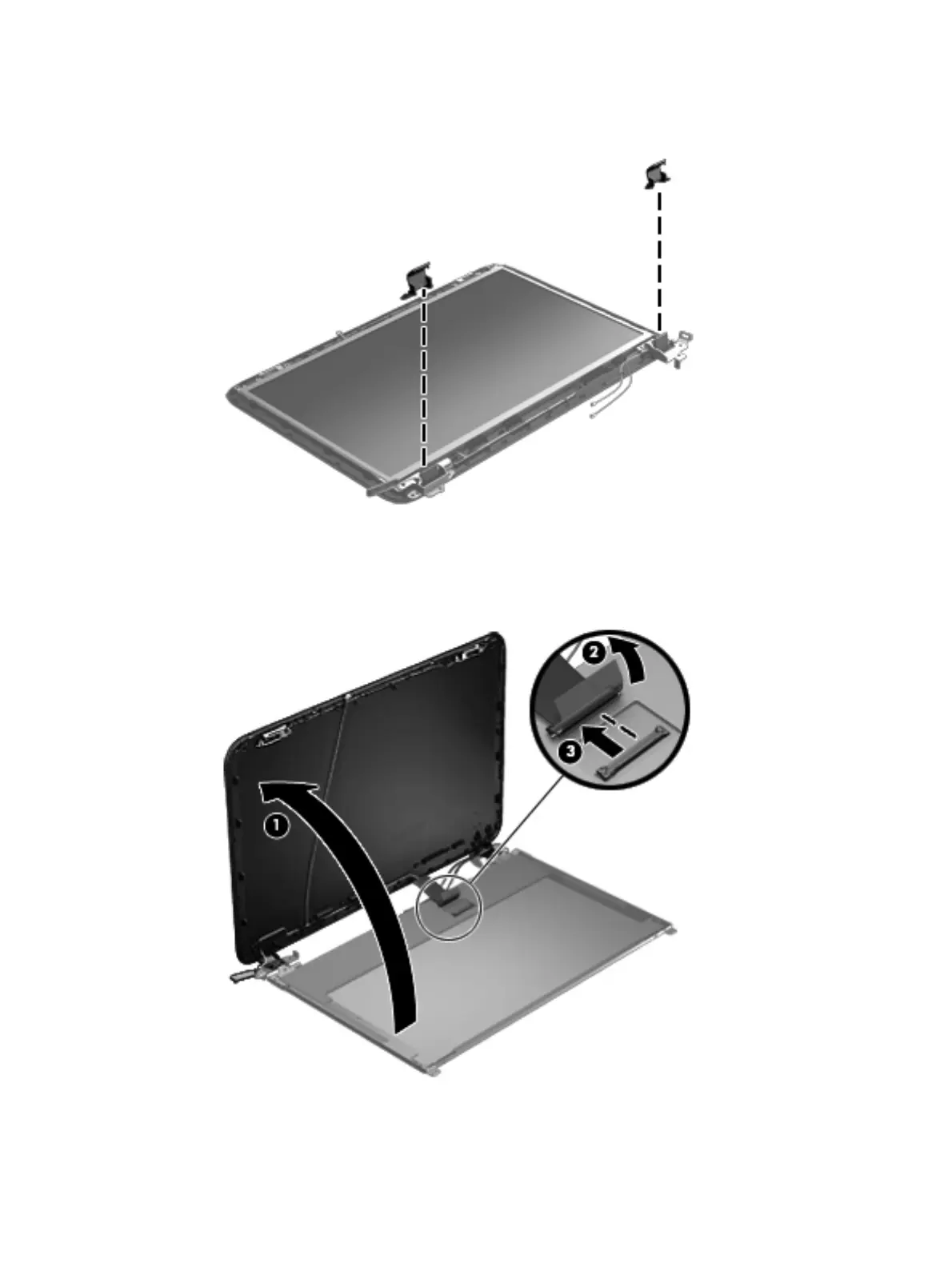 c. Lift the top edge of the display enclosure, (1) and then swing it up and forward until it is