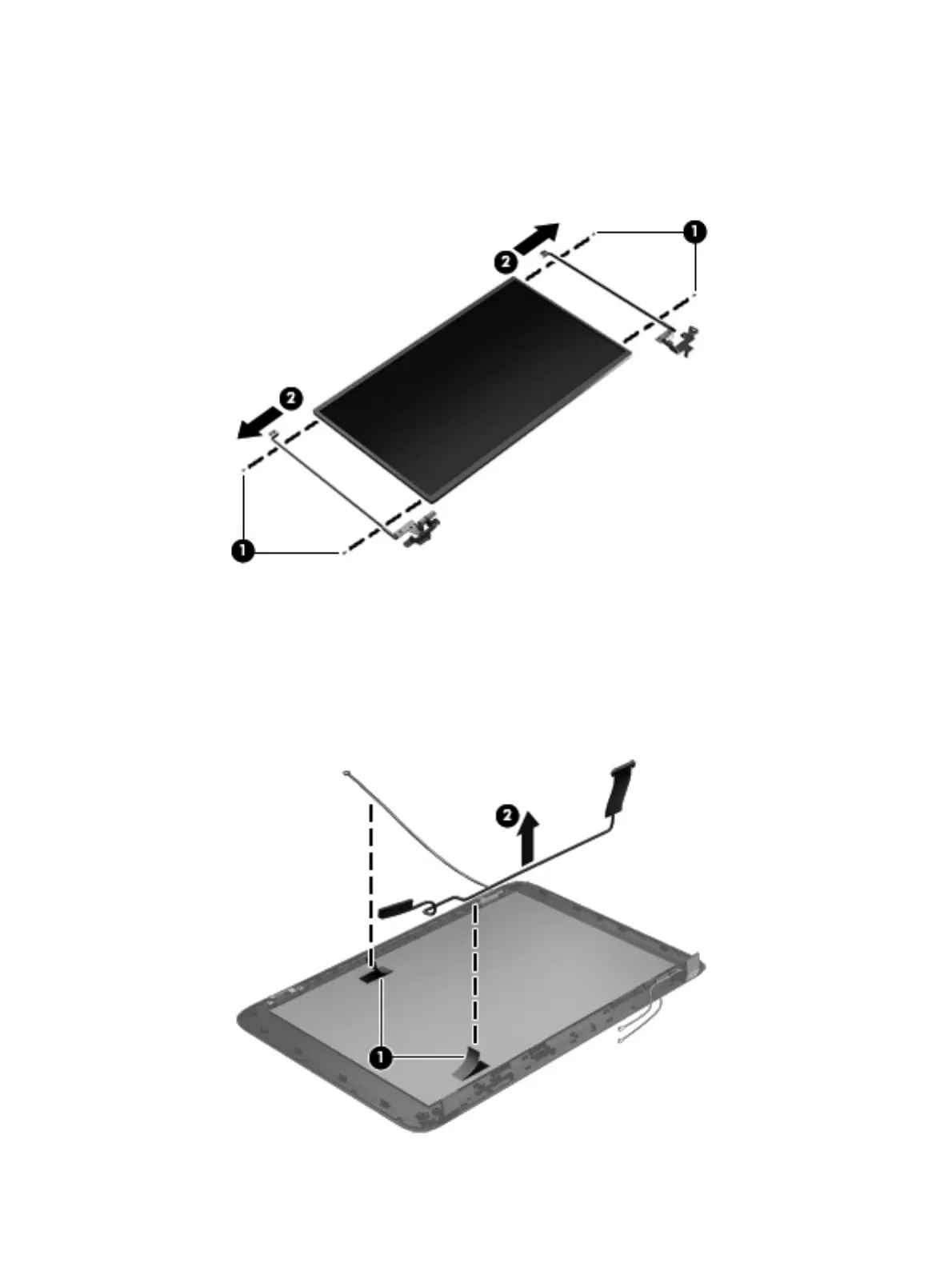 b. Remove the display hinges (2). The display hinges include the display hinges and brackets
