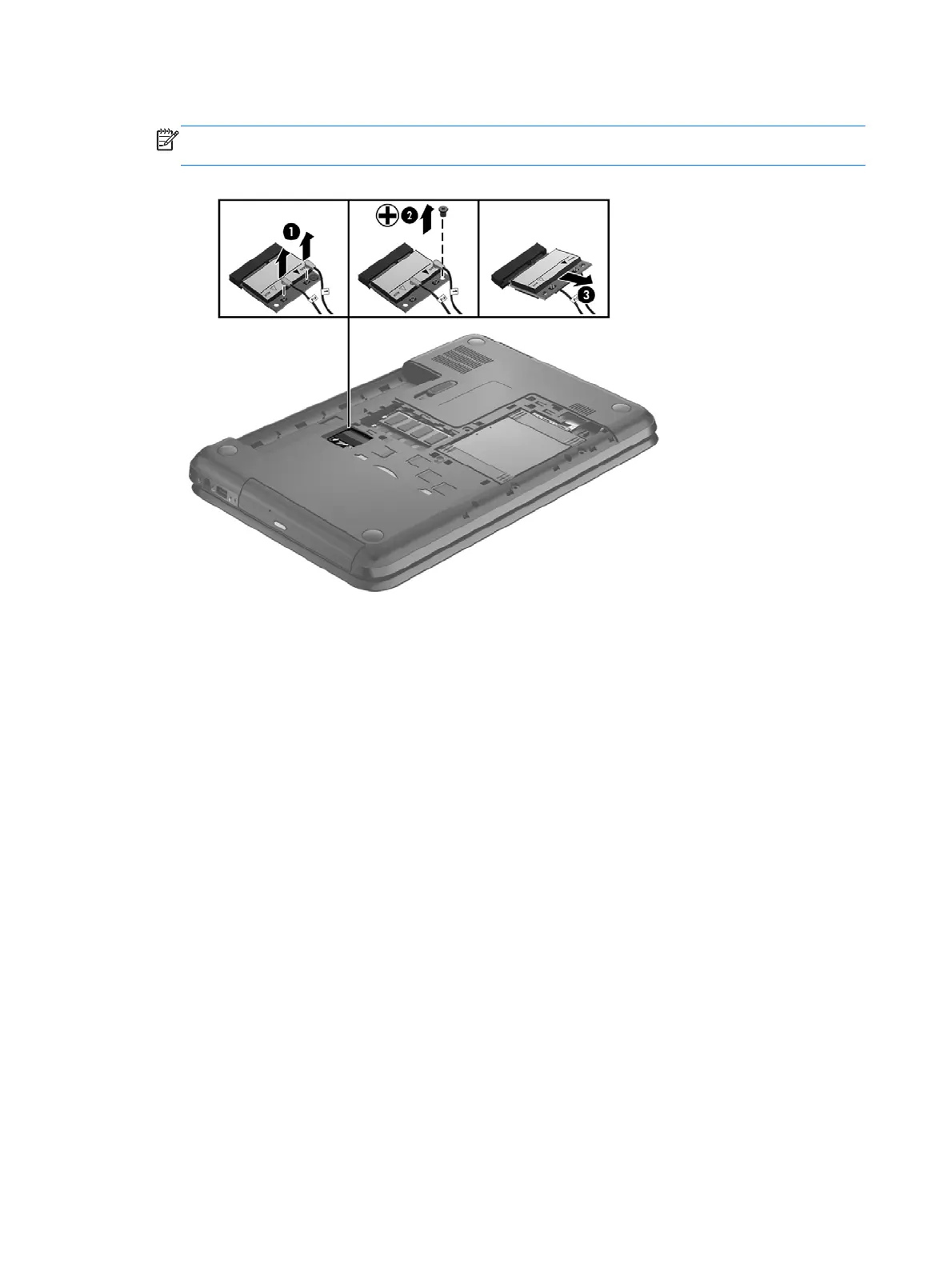 3. Remove the WLAN module by pulling the module away from the slot at an angle (3).
