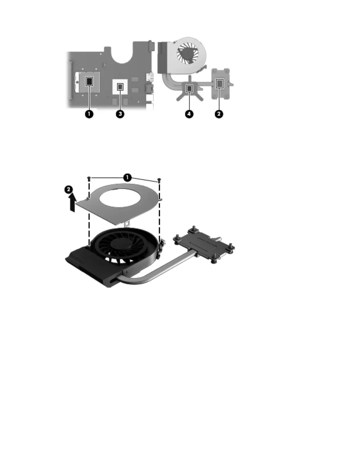 2. Remove the two PM 1.5 × 2.5 screws (1) that secure the fan to the heat sink and remove the two
