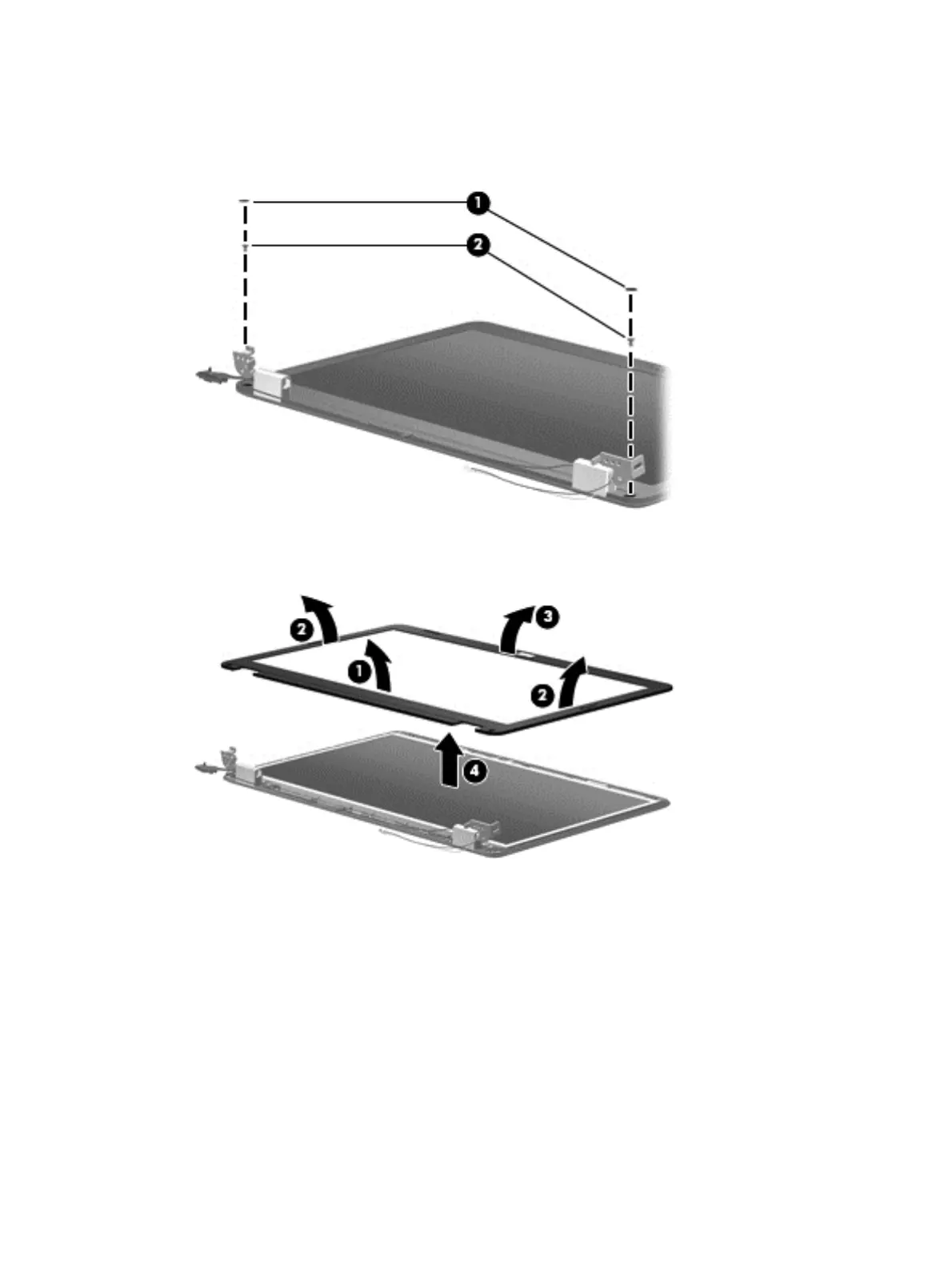 1. Remove all screw covers (1) and screws (2) that secure the display bezel to the display