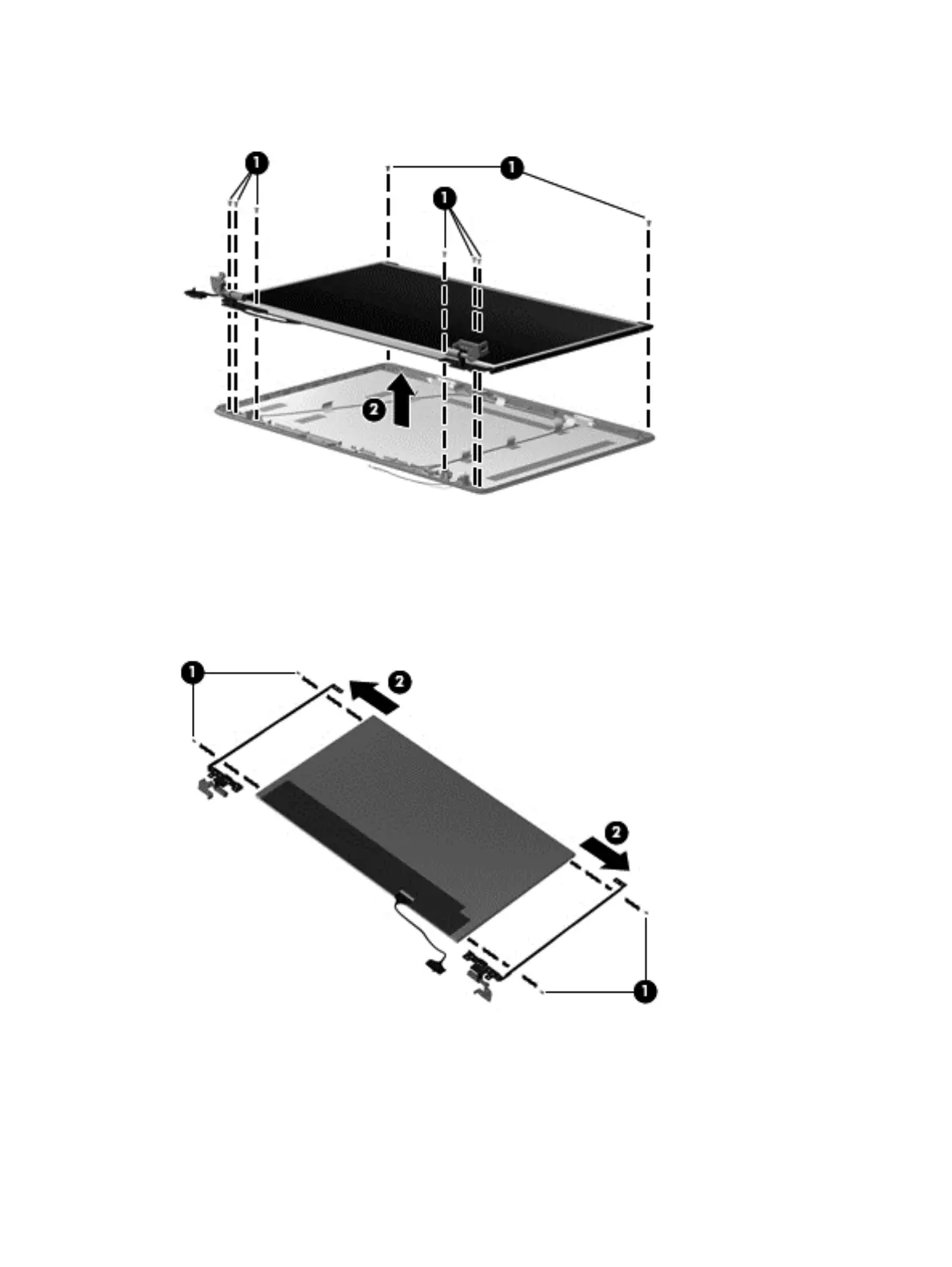 16. Remove the display panel (2) from the display enclosure. The display panel is available using