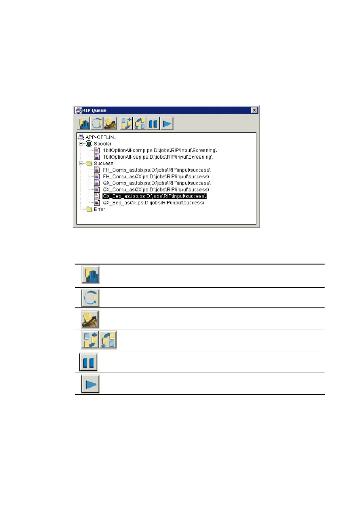 在 HP Indigo RIP 工具栏中,单击 RIP Queue Manager 按钮。出现 RIP Queue 窗口