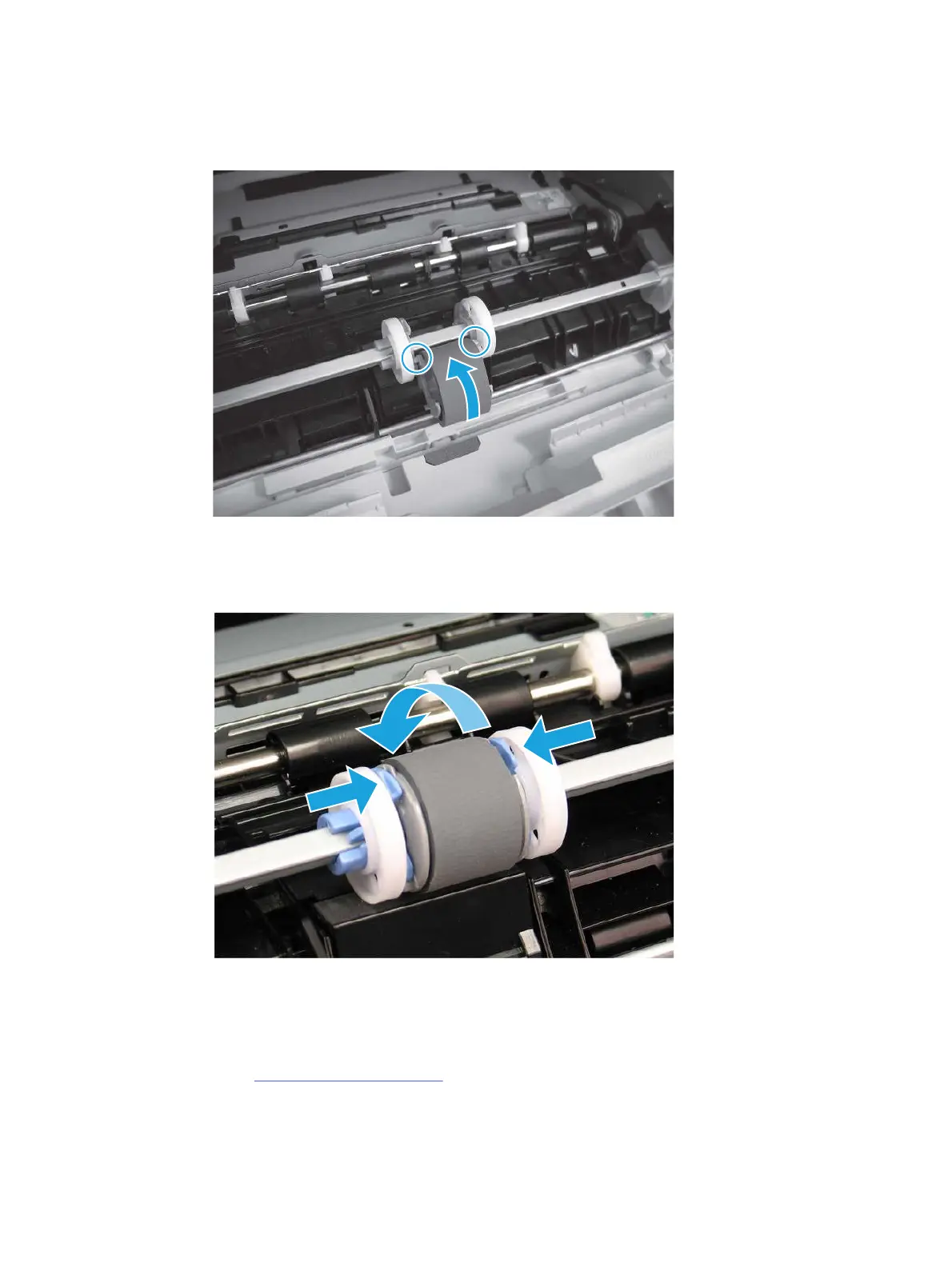 f. Position the pickup roller with the pins in the provided slots on the holder, and then rotate the