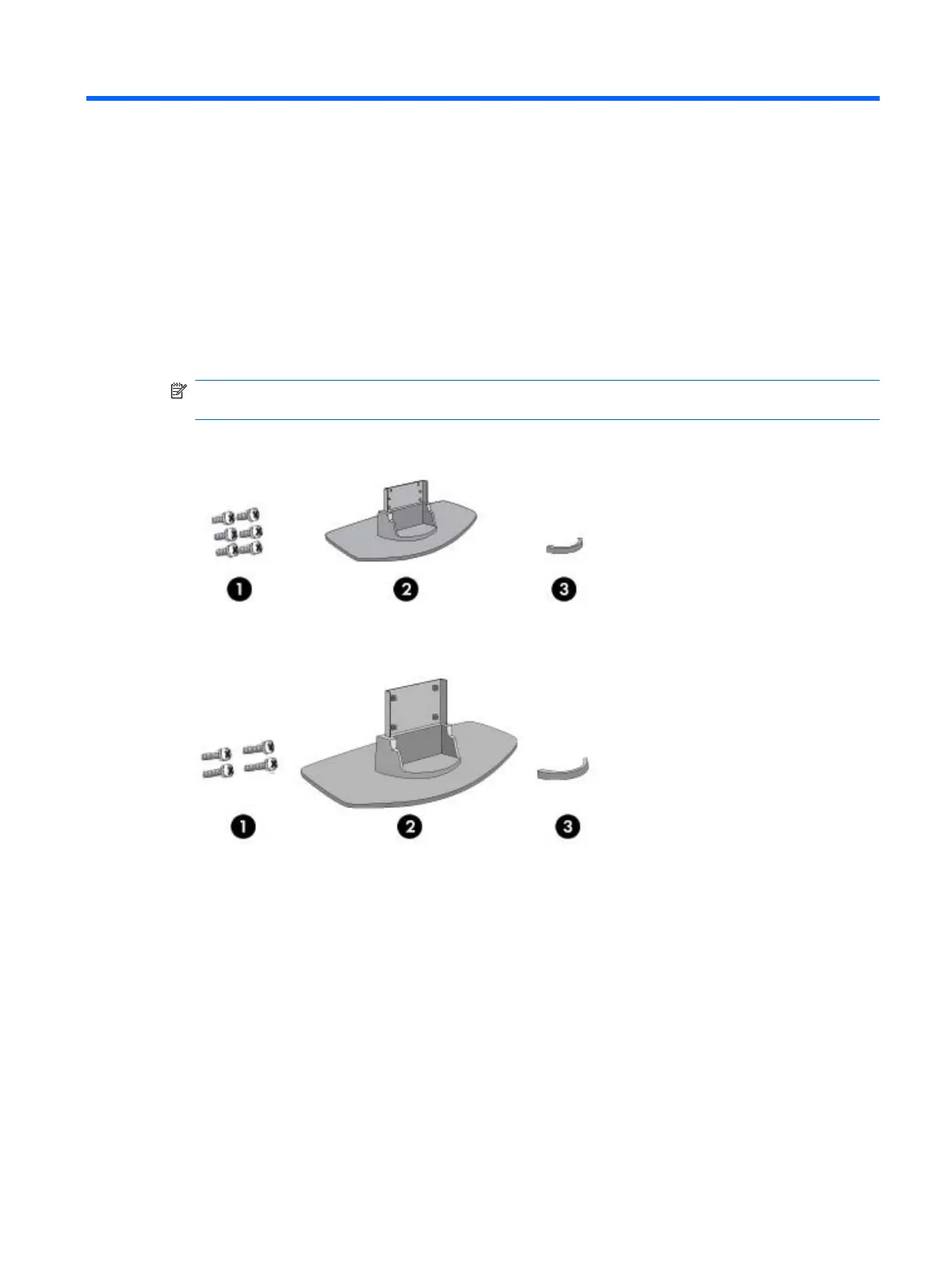 1. Haal de schroeven (1), de monitorstandaard (2) en de kabelgeleiderklemmen (3) uit de