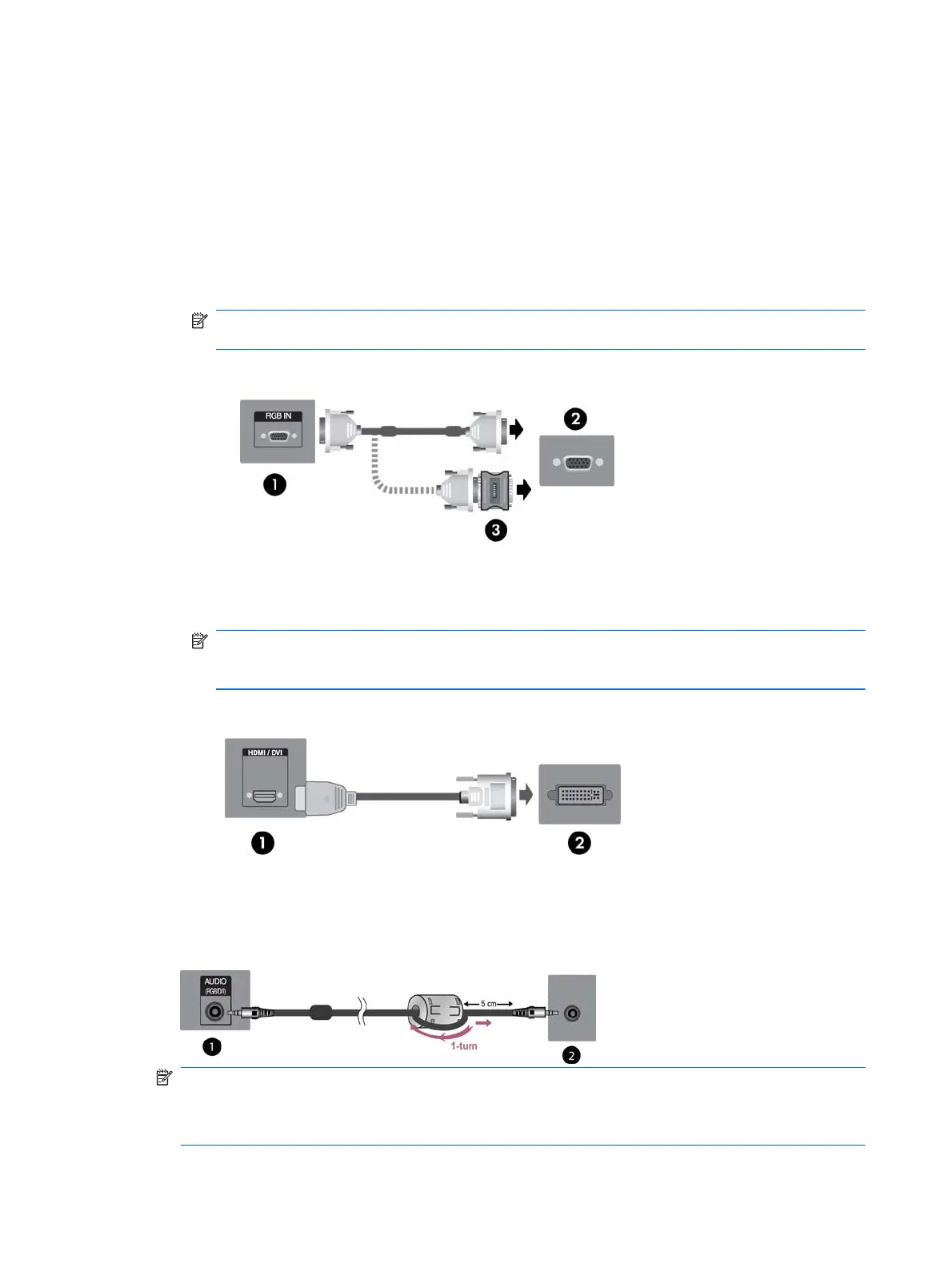 3. Sluit de audiokabel (apart leverbaar) aan op de audioconnector (RGB/DVI) (1) aan de