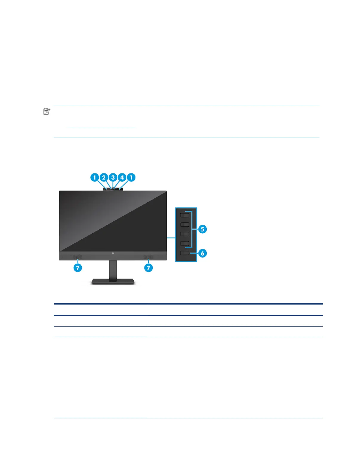 Gebruik deze illustratie en tabel om de onderdelen aan de voorkant en zijkant van de monitor te herkennen.