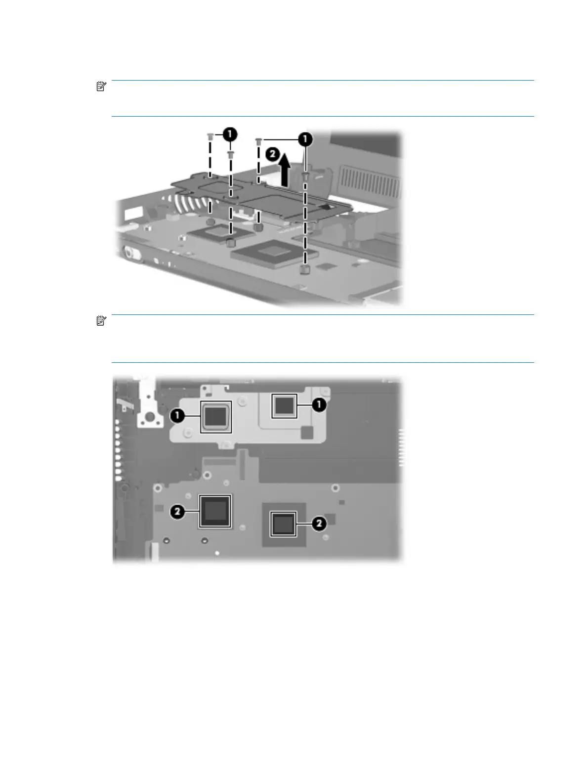 used on the processor (1), and thermal tape is used on the Northbridge chip (2). Replacement
