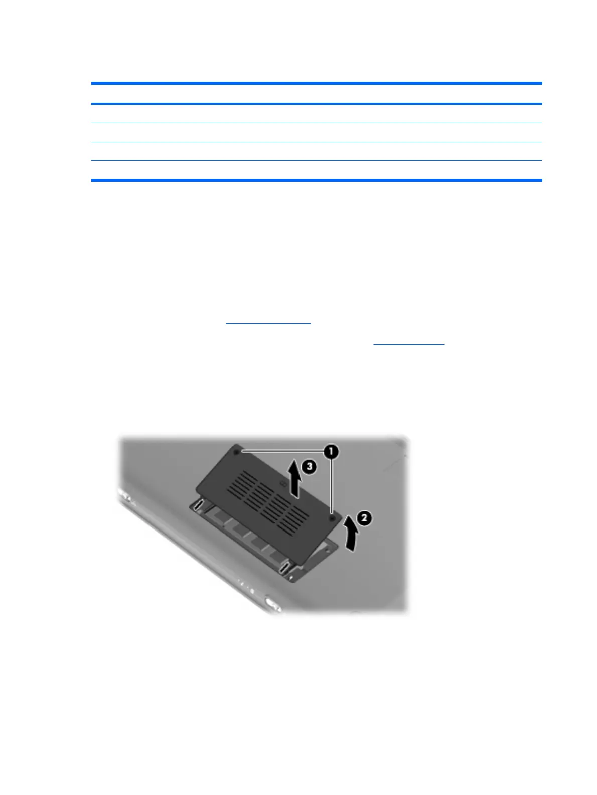 1. Loosen the 2 Phillips 2.0×3.0 captive screws (1) that secure the memory module compartment