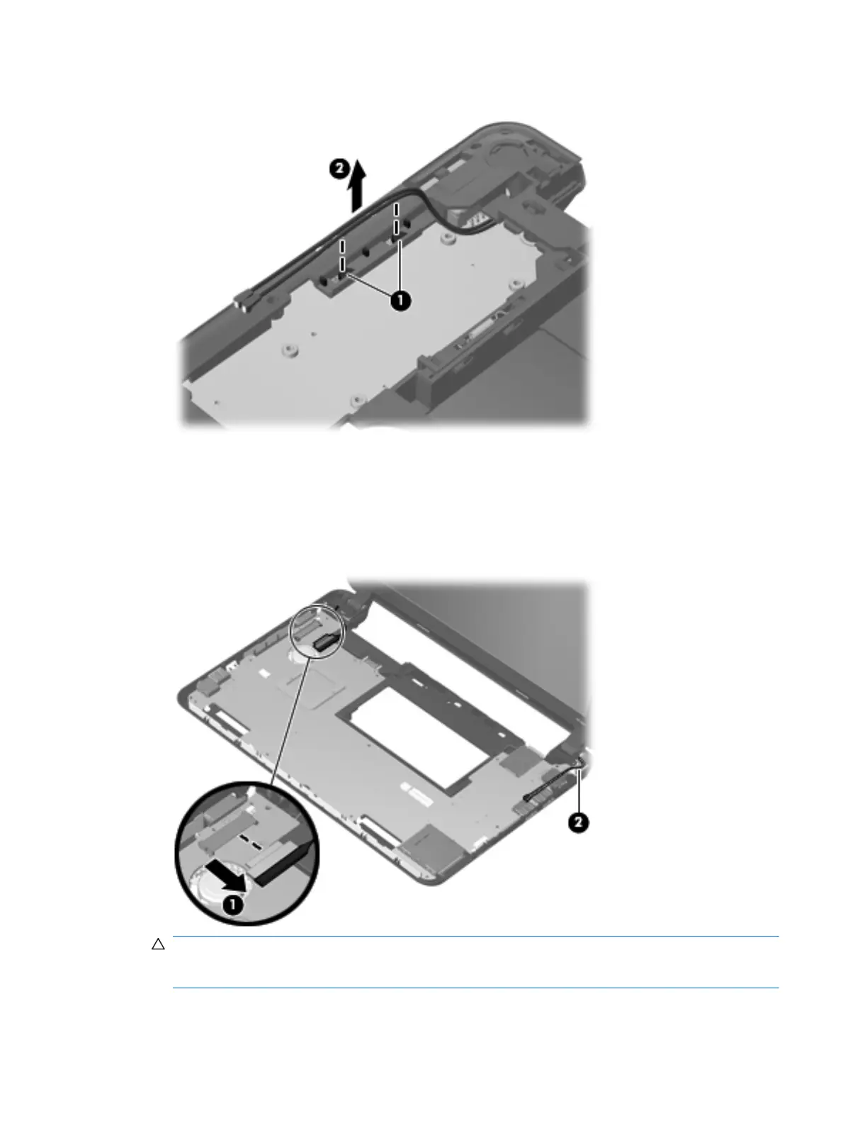3. Release the WLAN antenna cables (1) from the clips built into the base enclosure (2).