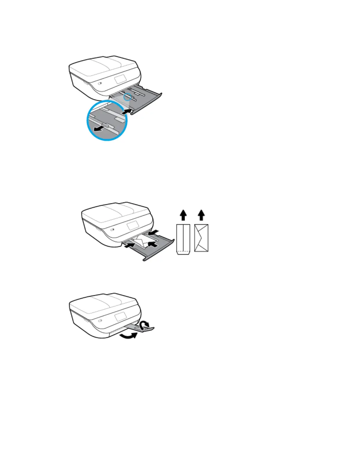 ● Insert one or more envelopes in the center of the paper tray. The print side should face down. Load