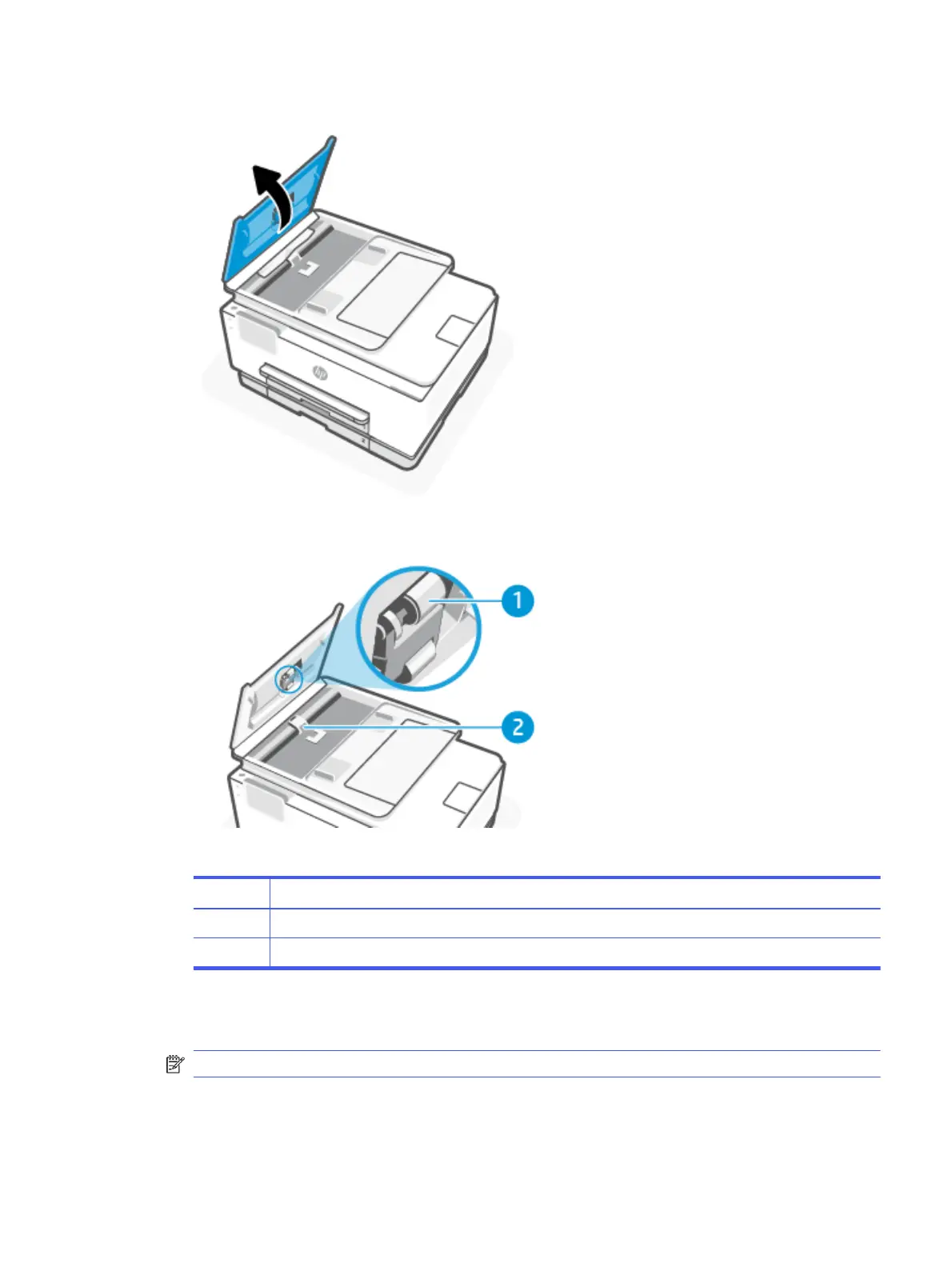 4. Use the damp cloth to wipe any residue o the Rollers (1) or Separator pad (2).