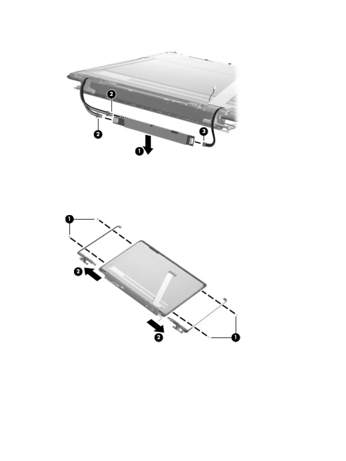 17. Disconnect the backlight cables (2) and display panel cable (3) from the display bezel.