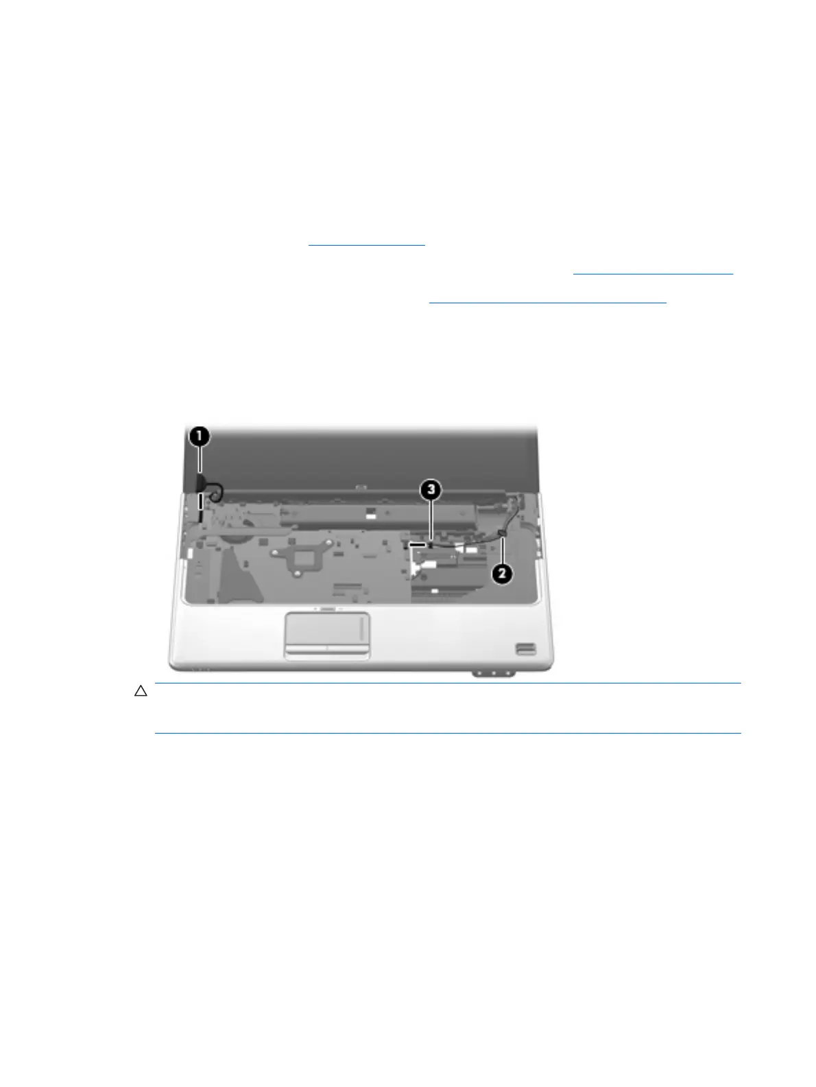 5. Disconnect the wireless antenna cables from the WLAN module (see