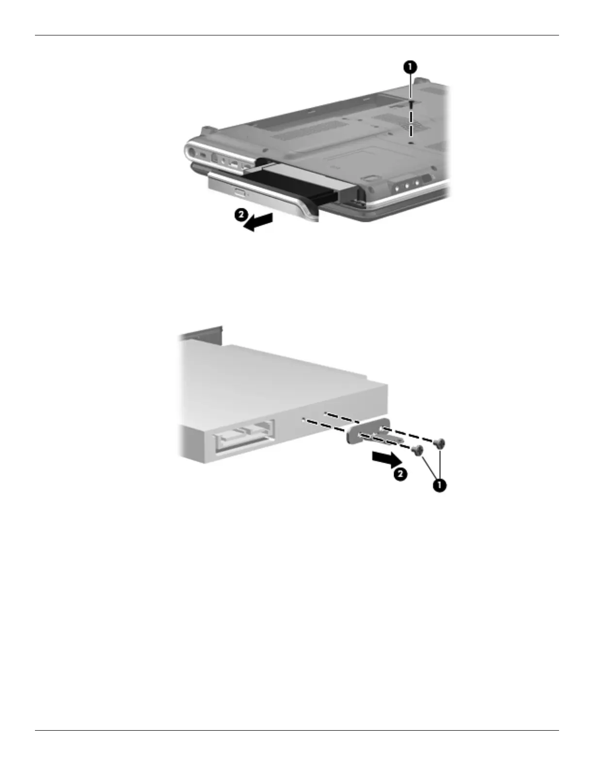 b. Remove the two Phillips PM2.0×3.0 screws 1 that secure the optical drive bracket to the optical drive.