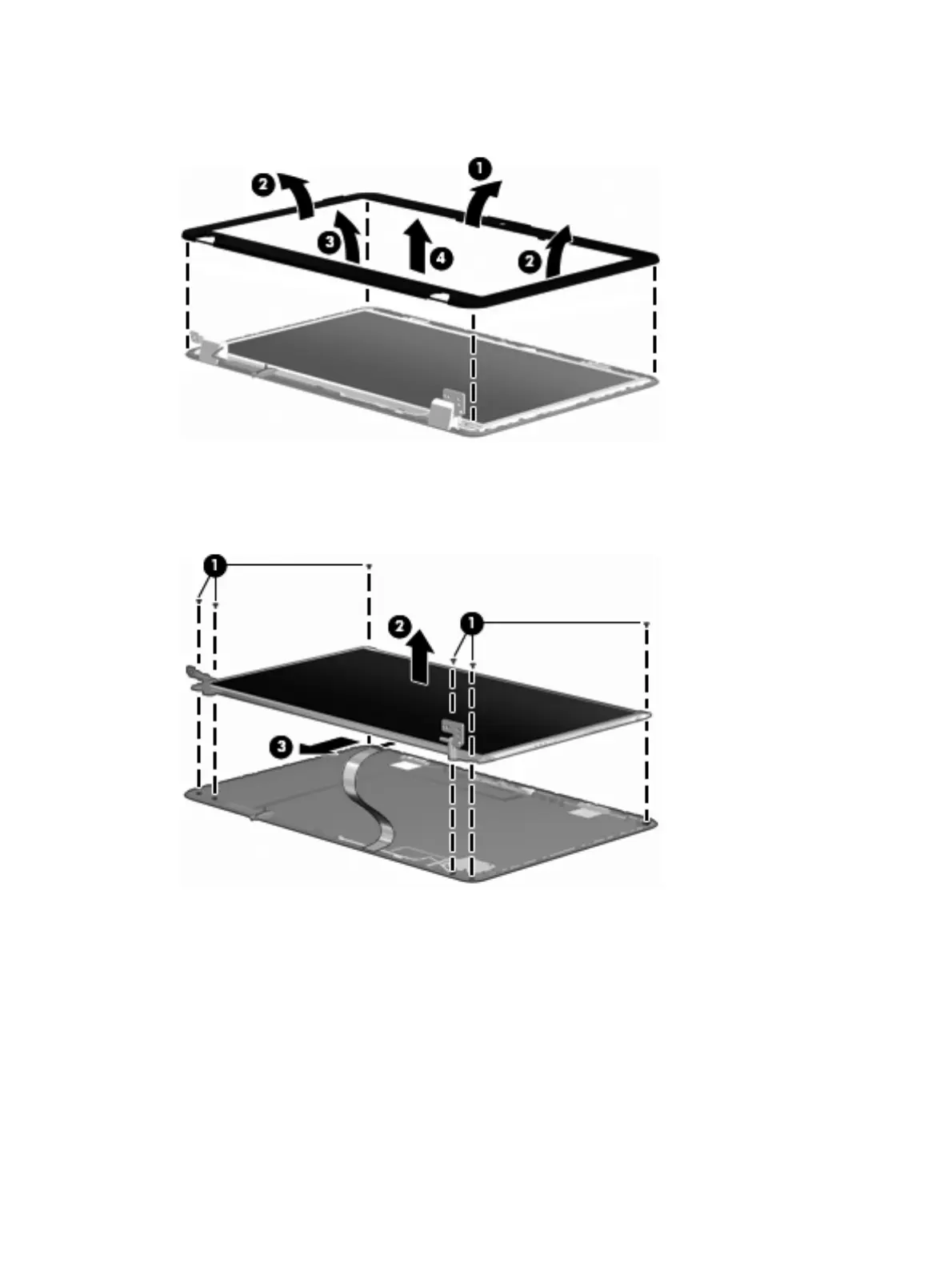 Remove the display bezel (4). The display bezel is available using spare part number