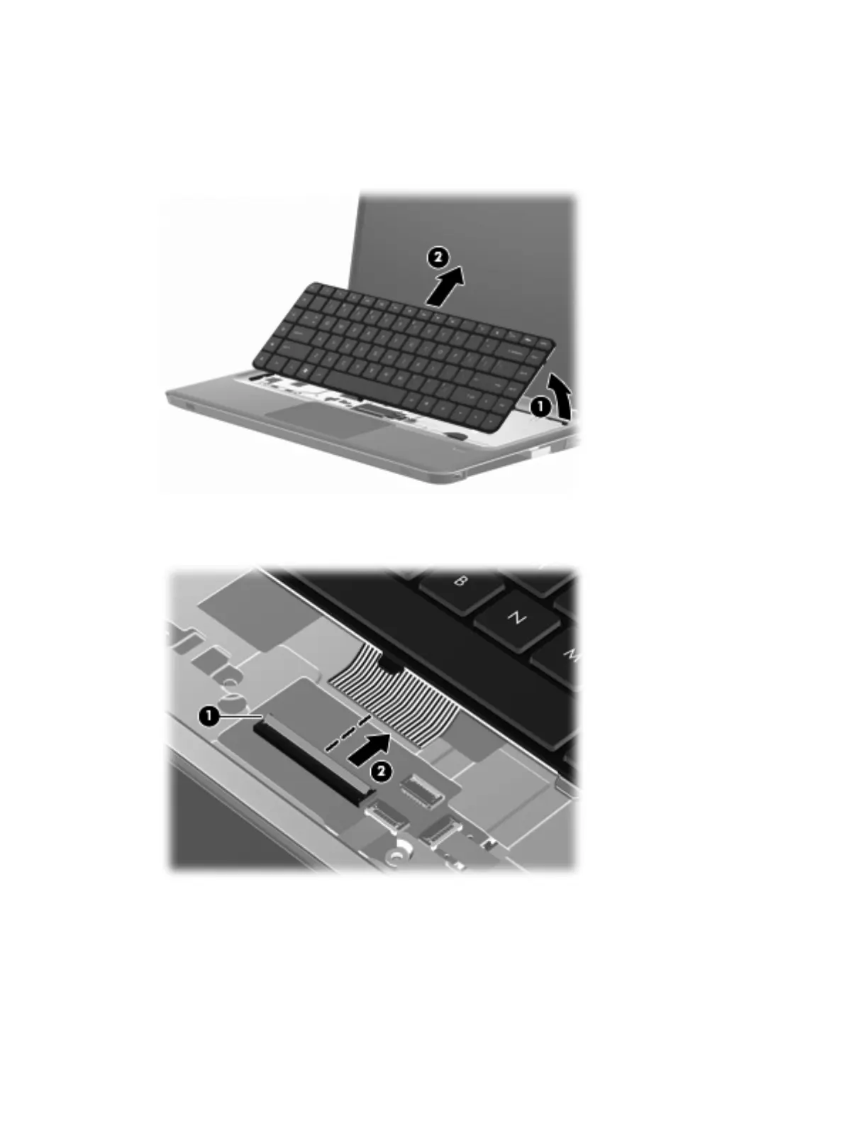 5. Lift (1) and release (2) the keyboard until the keyboard connector on the system board is