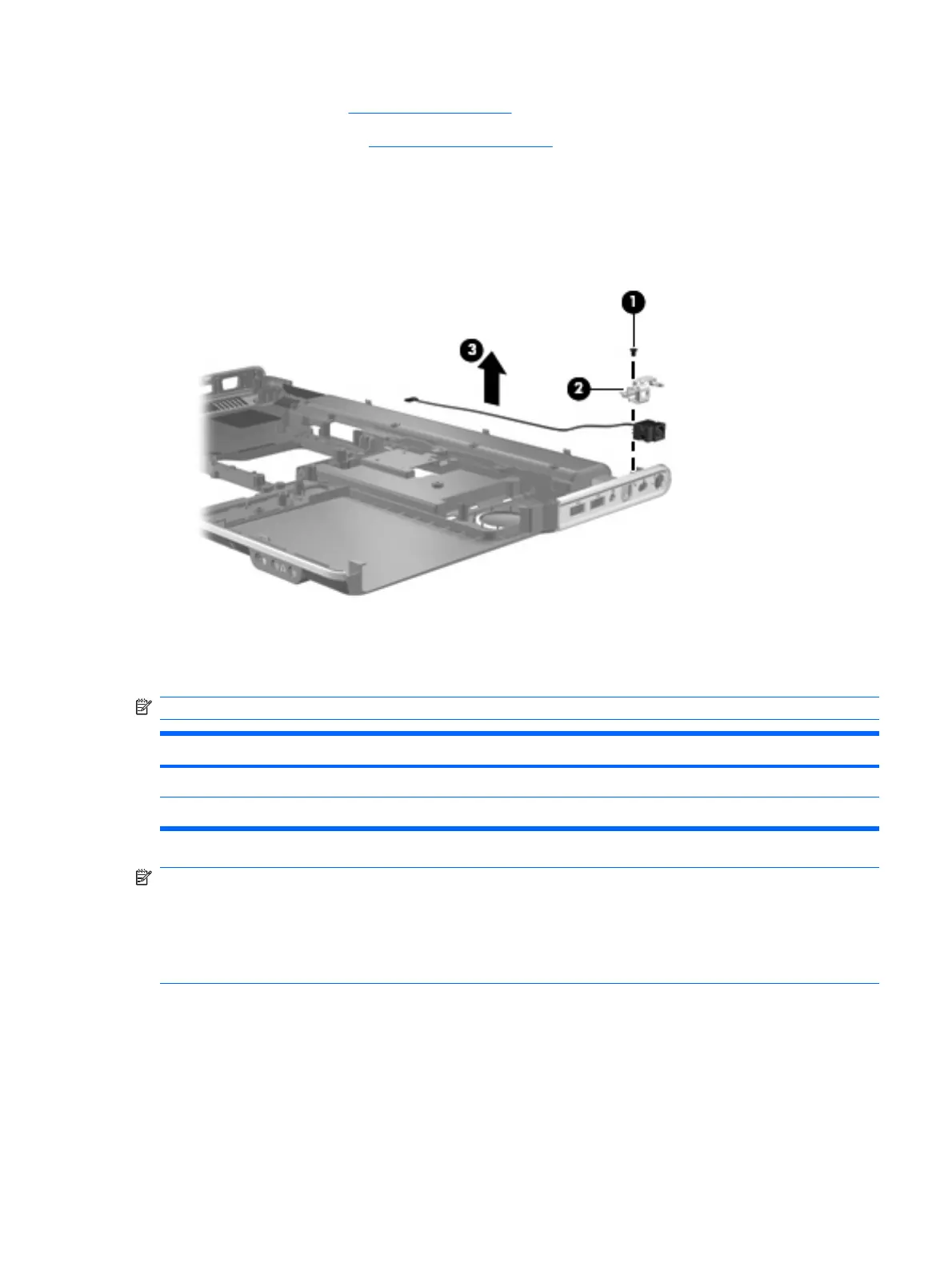 1. Remove the Phillips PM2.5×7.0 screw (1) that secures the power connector and bracket (2) to the