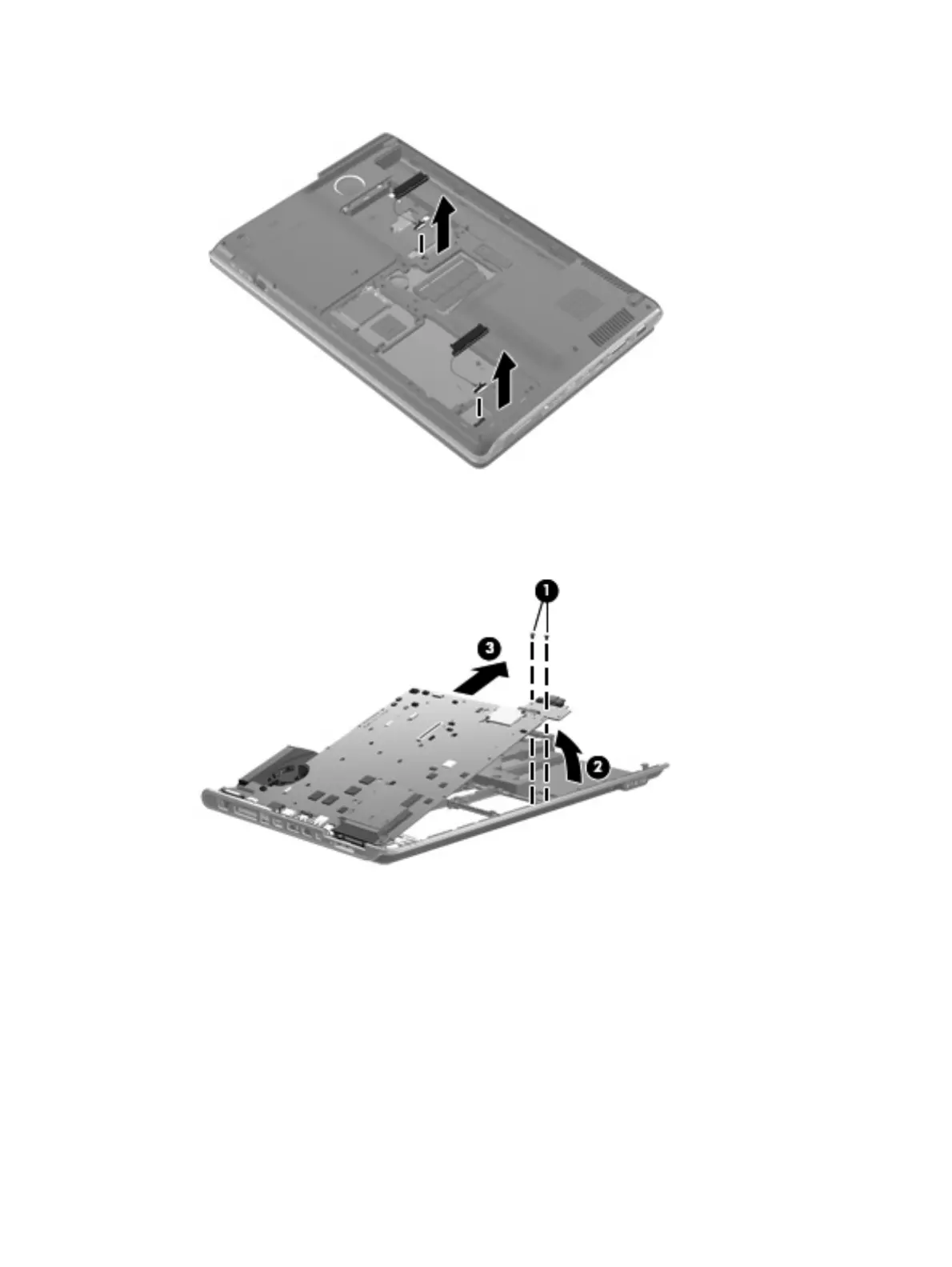 3. Remove the two Phillips PM2.5×5.0 screws (1) that secure the system board to the base enclosure.