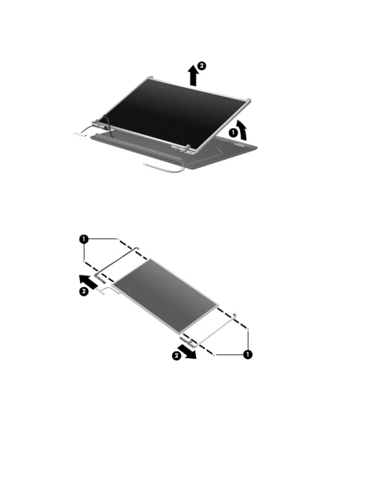 25. Flex the bottom of the display panel (1) back and release the display hinges. Remove the display