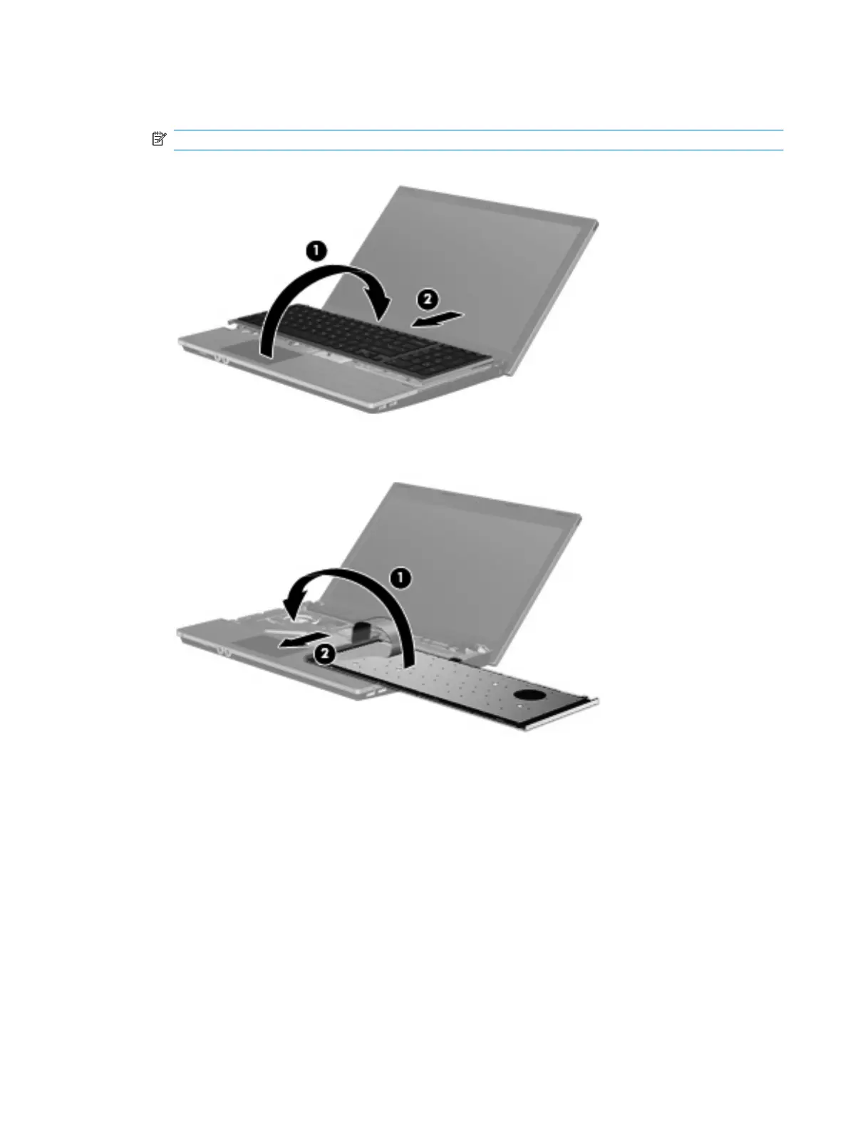 8. Draai het toetsenbord om (1), plaats het in de toetsenbordruimte en schuif het naar binnen (2) tot