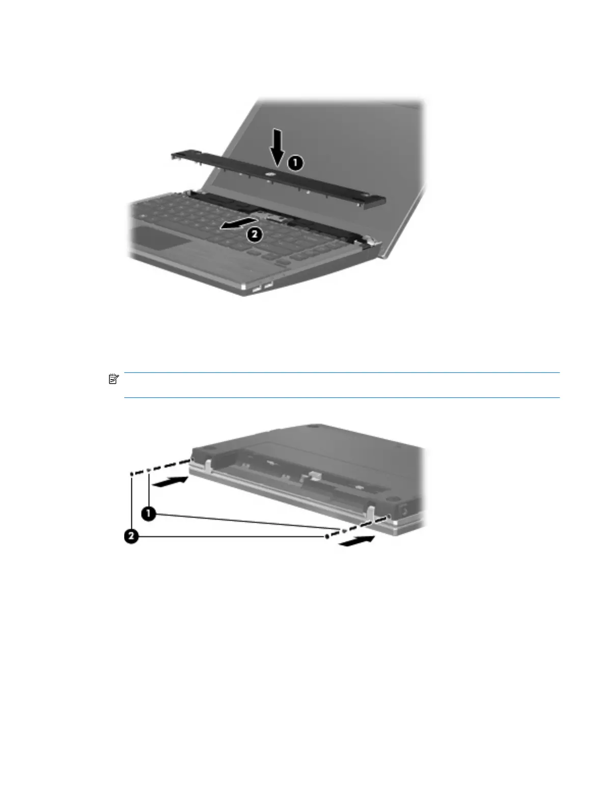 13. Plaats de 2 schroeven (1) en hun afdekplaatjes (2) terug op de achterkant van de computer.