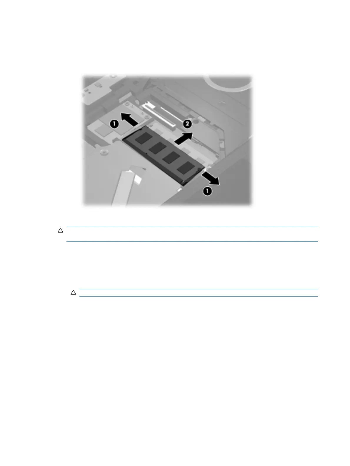b. Pak de geheugenmodule aan de rand vast (2) en trek de module voorzichtig uit het