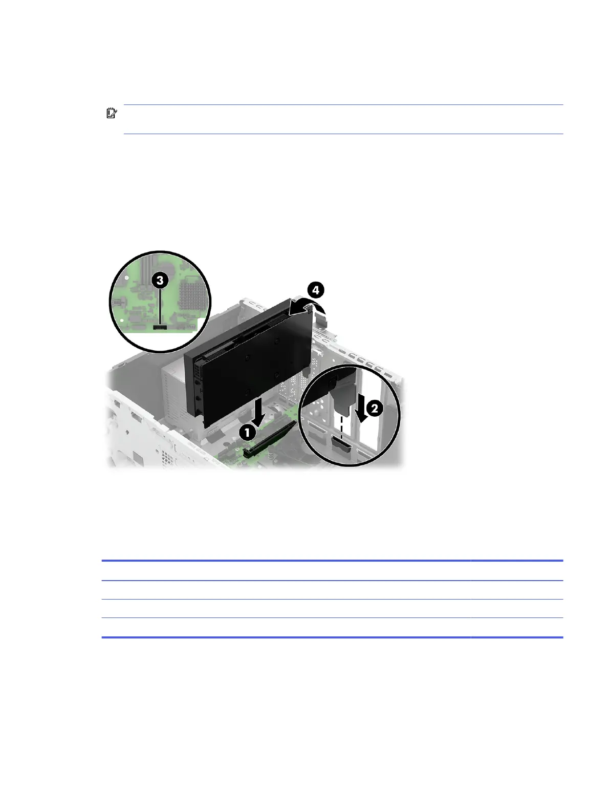 1. Insert the graphics card (1) into the socket on the system board. Be sure to insert the bottom of the