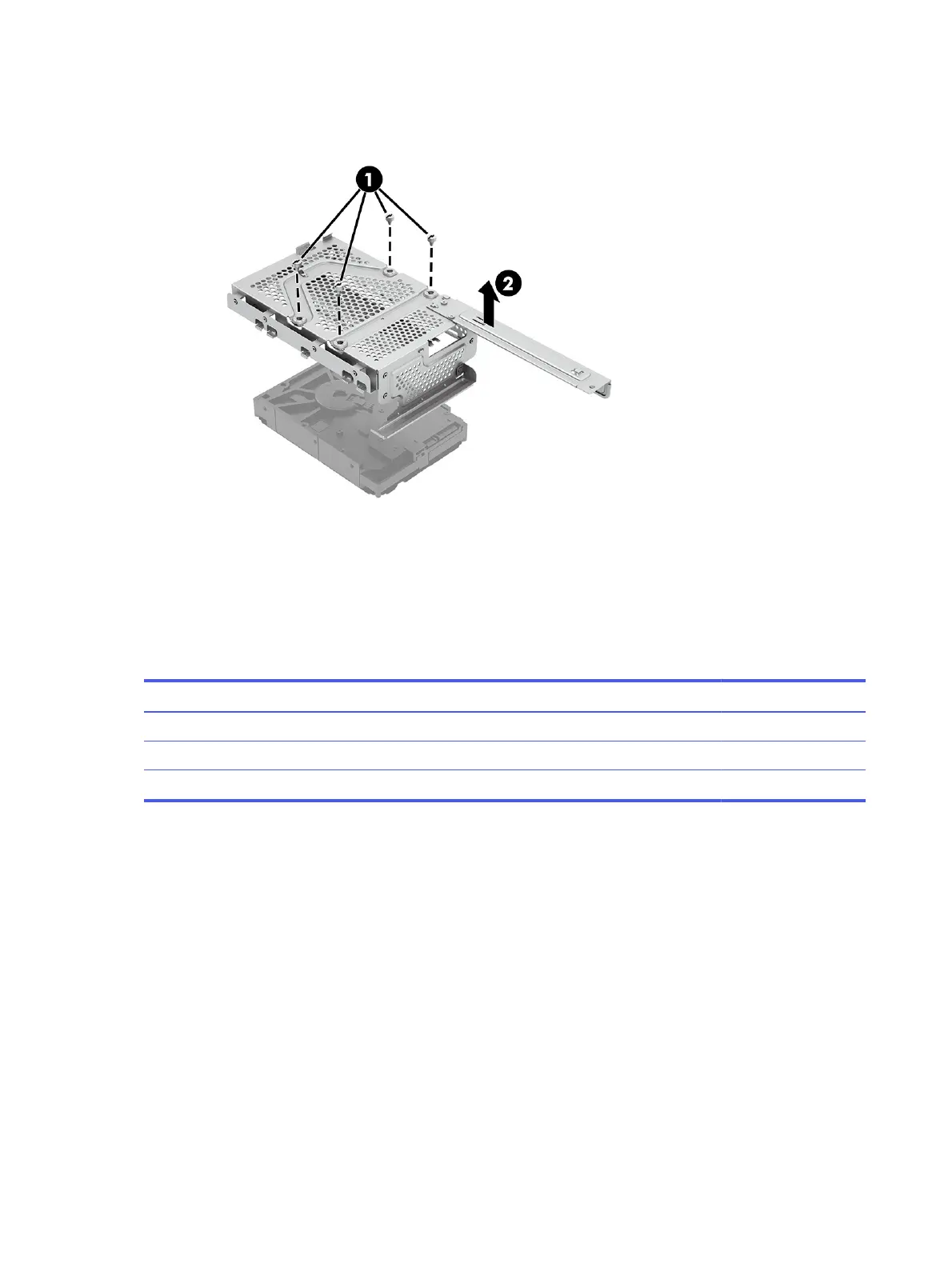8. Remove the four screws (1) that secure the drive to the drive cage, and then lift the cage (2) off the