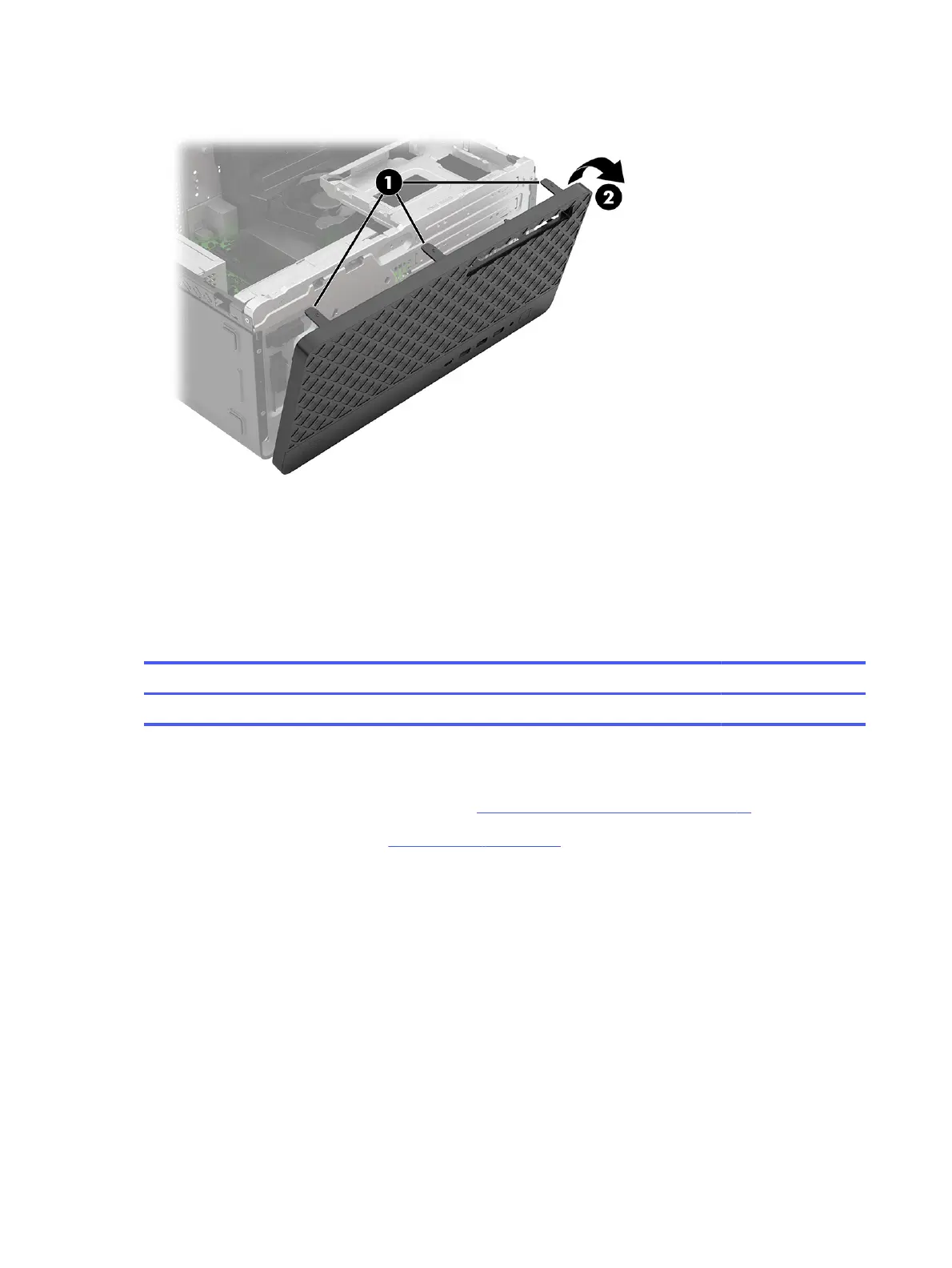Pull the three tabs (1) upward, and then rotate the bezel (2) off the computer.