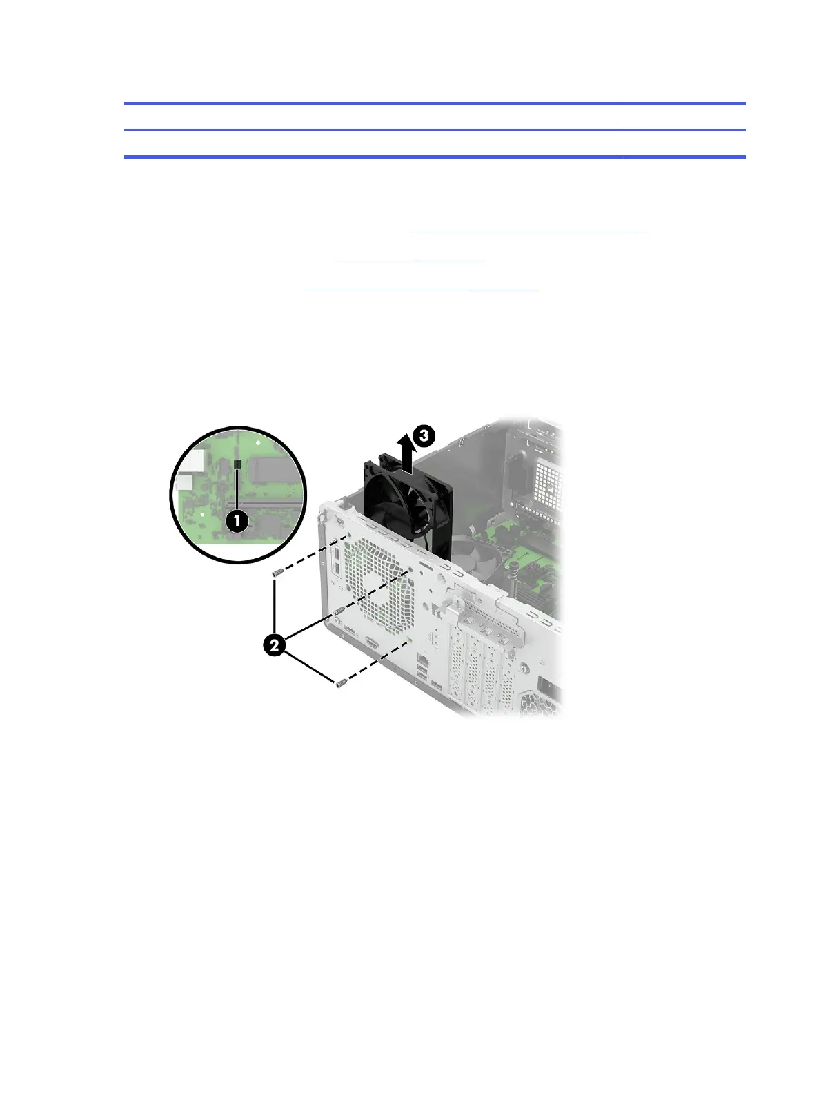 2. From the back of the computer, remove the three screws (2) that secure the fan, and then lift the fan