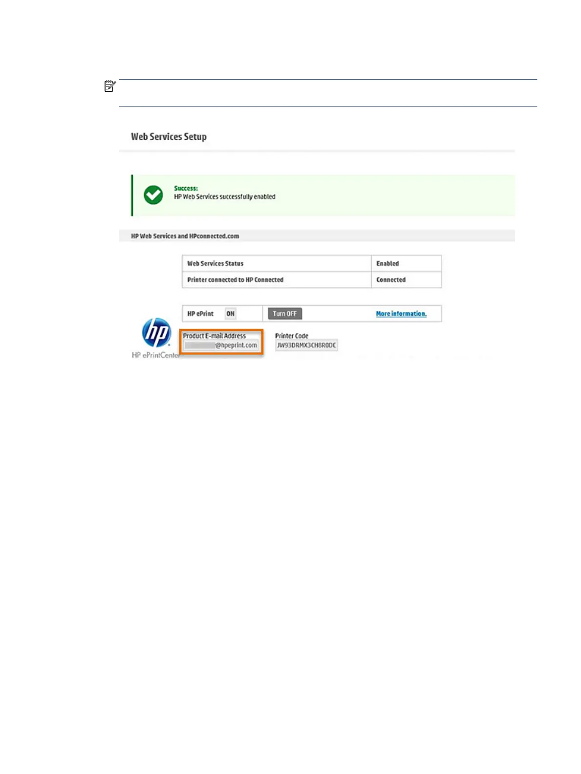 NOTE: Save the printer email address for a later step. You will need this information to add printers to HP