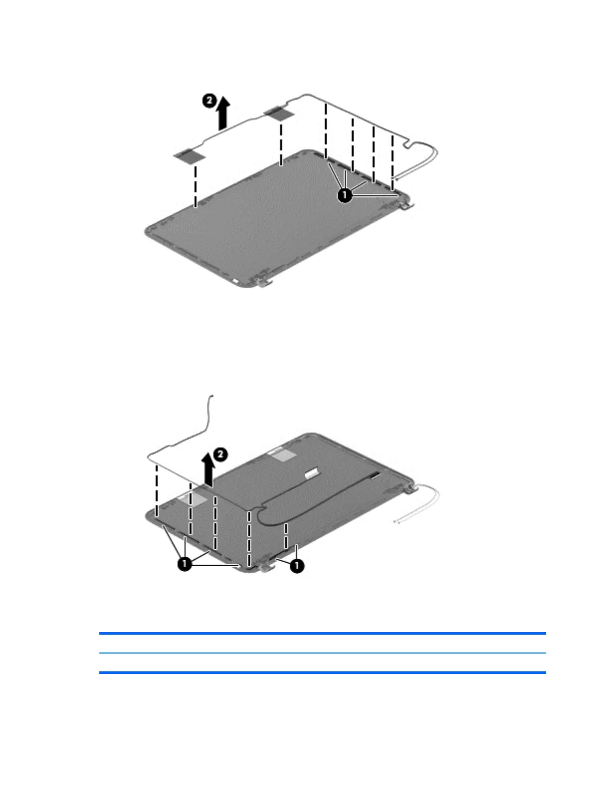 a. Release the wireless antenna cables from the clips (1) built into the display enclosure.