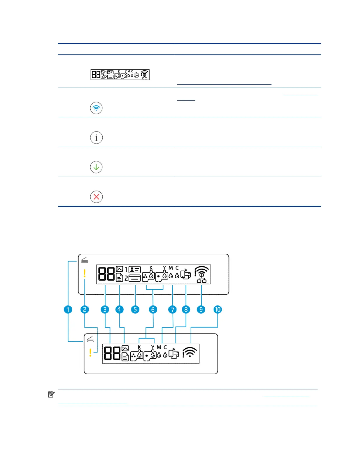 6 Wi-Fi button Turn on or o the wireless capability of the printer. See Wi-Fi status, light,